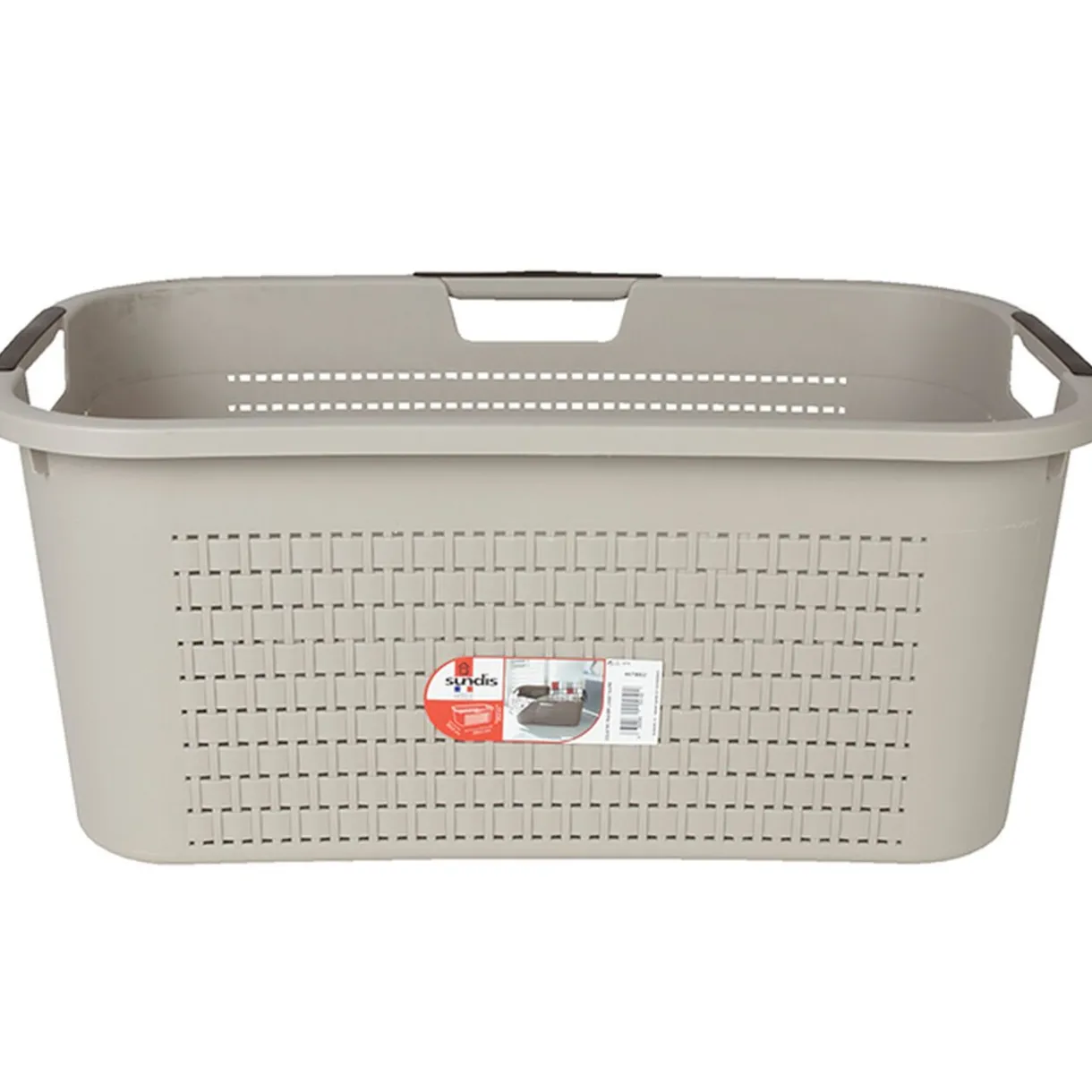 Corbeille à linge couleur taupe, design rotin sur les 4 côtés avec 3 poignées latérales.