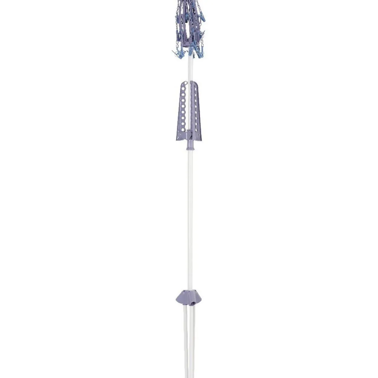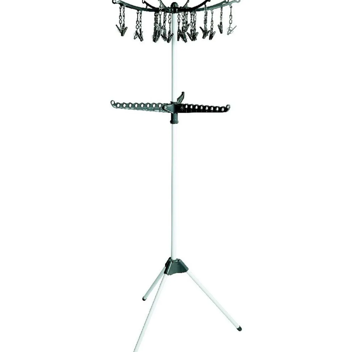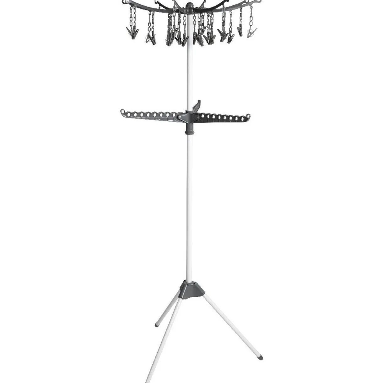 Etendoir à linge multiusage sur pieds, Ø 63 cm, h. 163 cm, structure métal et plastique renforcé. 3 portes-cintres et 24 pinces. Léger, se range facilement, bras rotatif.