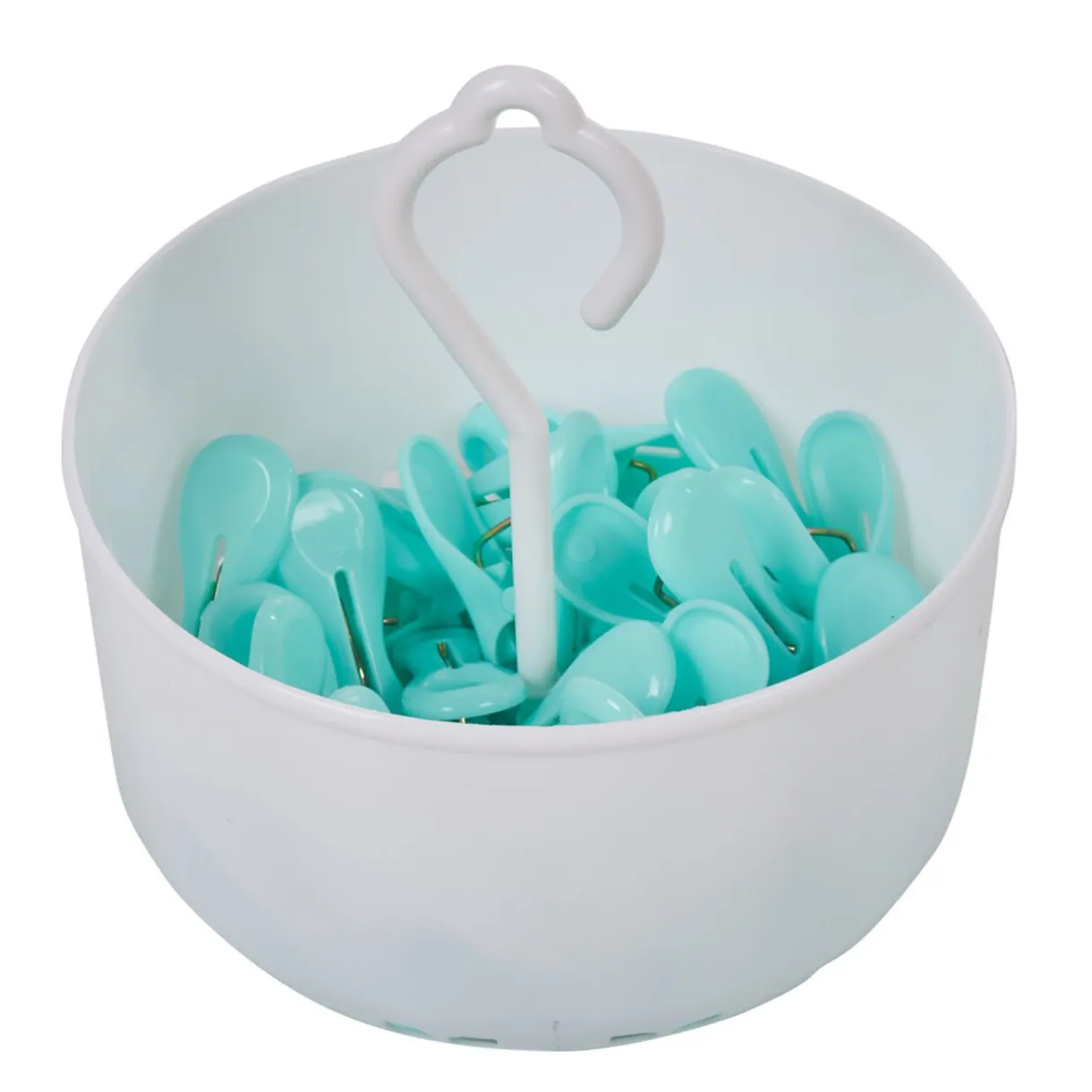 Panier rond blanc avec ses 24 pinces à linges colorées.