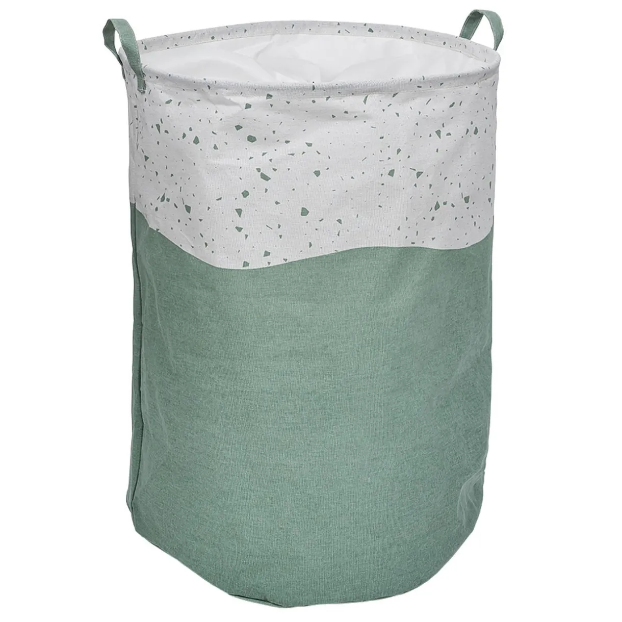 Panière à linge verte et blanche avec partie inférieure unie et partie supérieure motif terrazzo. Grande capacité, cette panière a une contenance de 91 litres, facile à transporter grâce à ses 2 poignées latérales et sa fermeture centrale.
