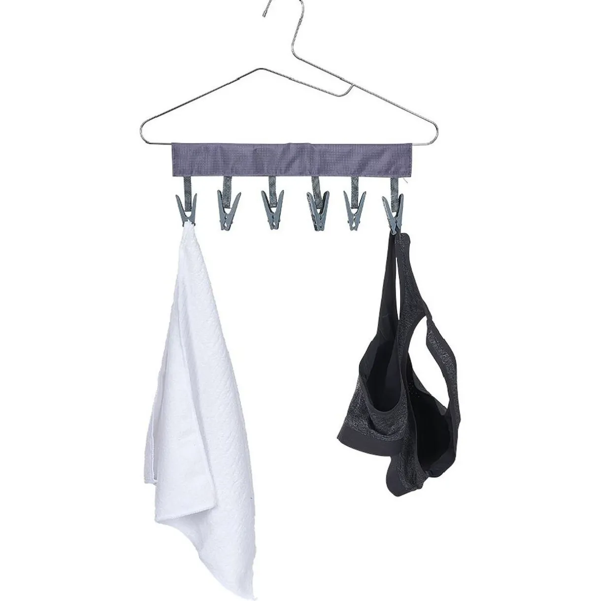 Séchoir pliable en tissu doté de 6 pinces à linge, pratique en voyage pour étendre votre linge en vacances.