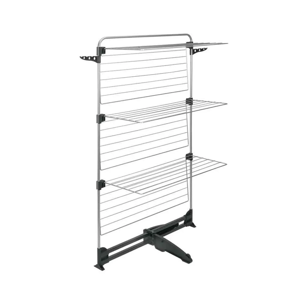 Séchoir tour sur 3 niveaux avec double porte-cintres et revêtement EPOTHERM, résistant et facile d’entretien.
