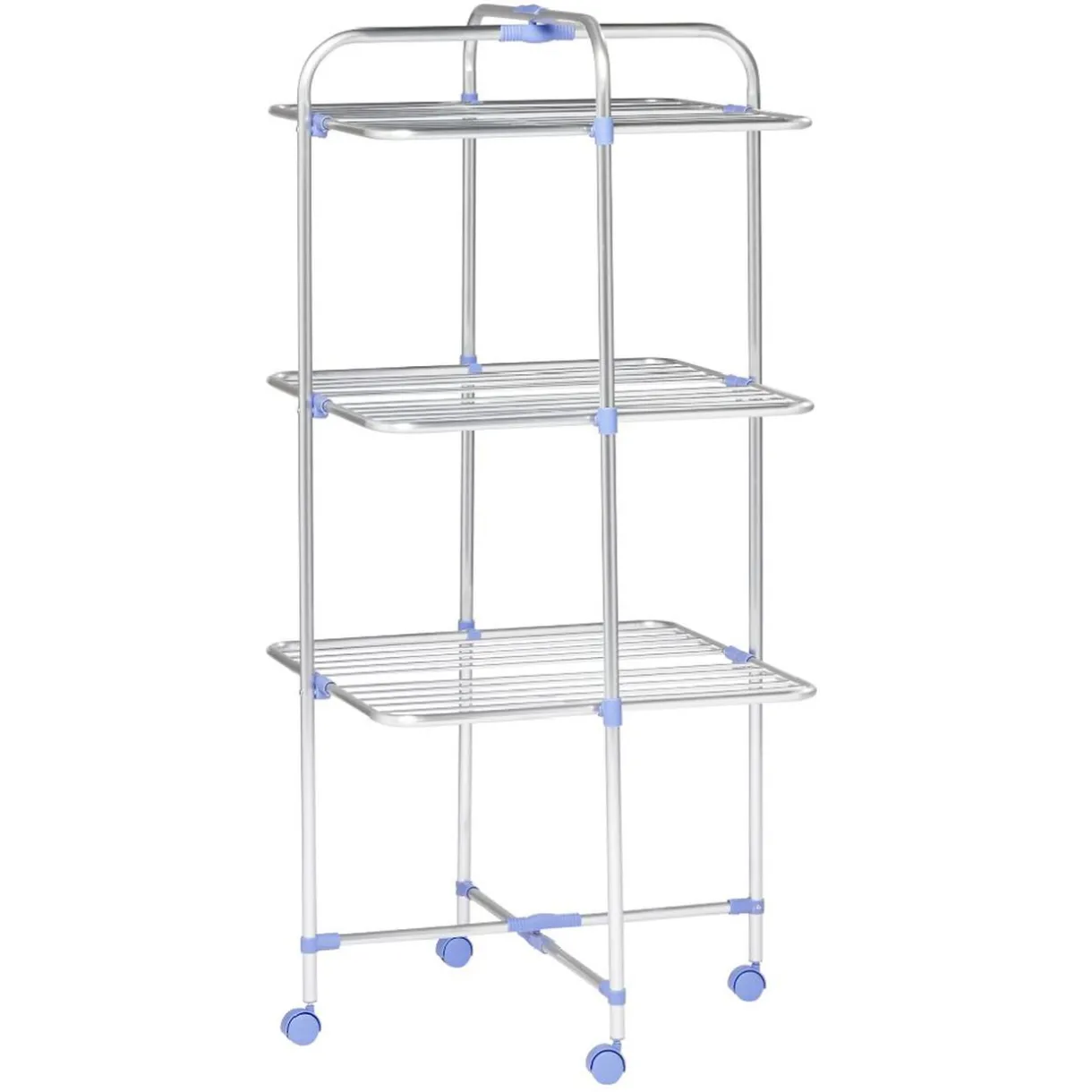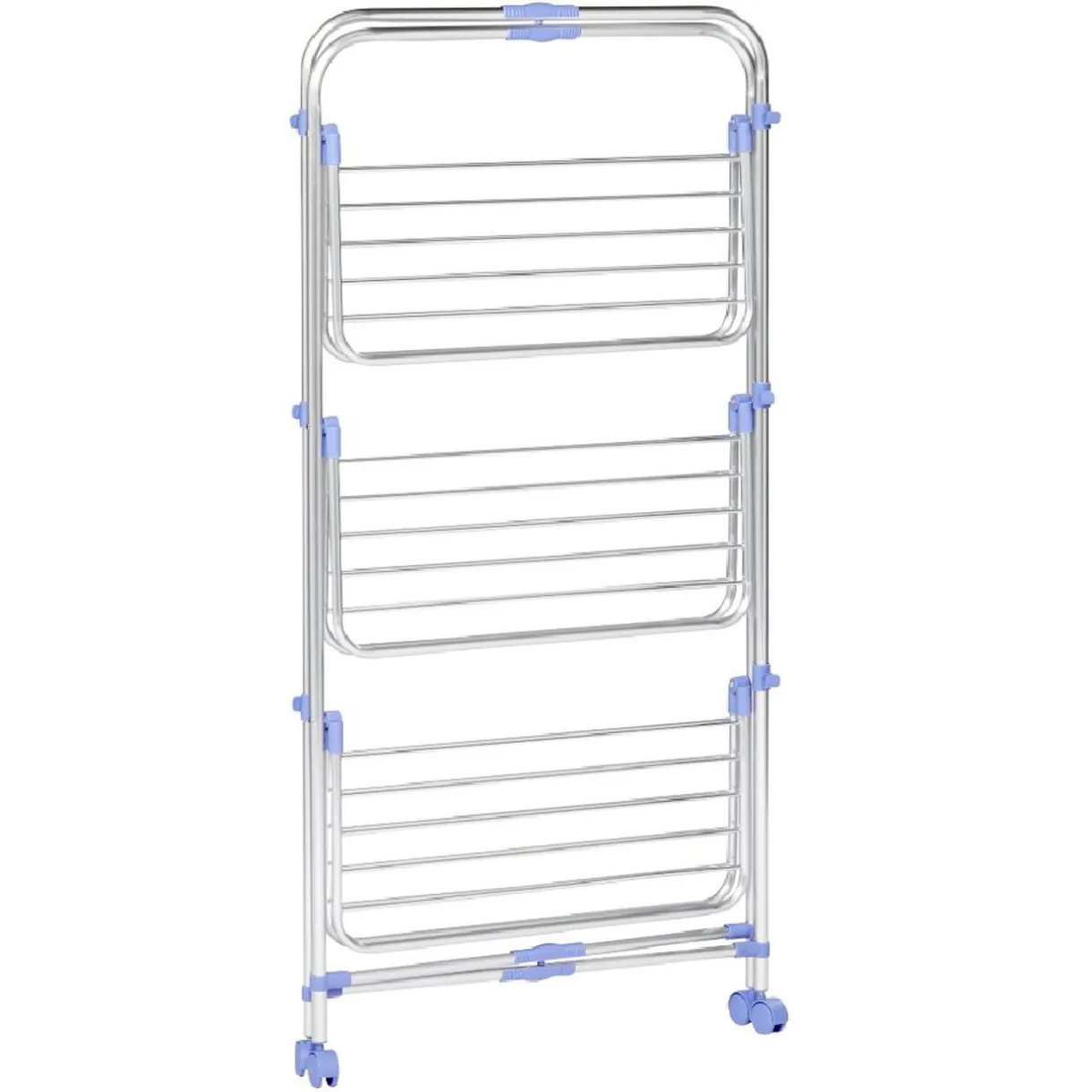 Séchoir tour bleu à 3 niveaux d’une capacité de 30 mètres d’étendage facile à déplacer grâce à ses 4 roues.