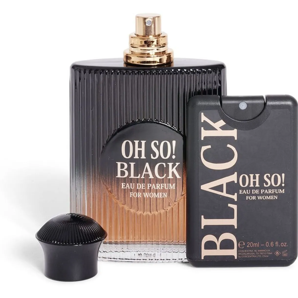 Coffret de parfum OH SO! de BLACK pour femme comprenant un flacon de 100ml et un au format voyage de 20ml, idéal pour se rafraîchir avec un parfum oriental et gourmand en toutes circonstances !