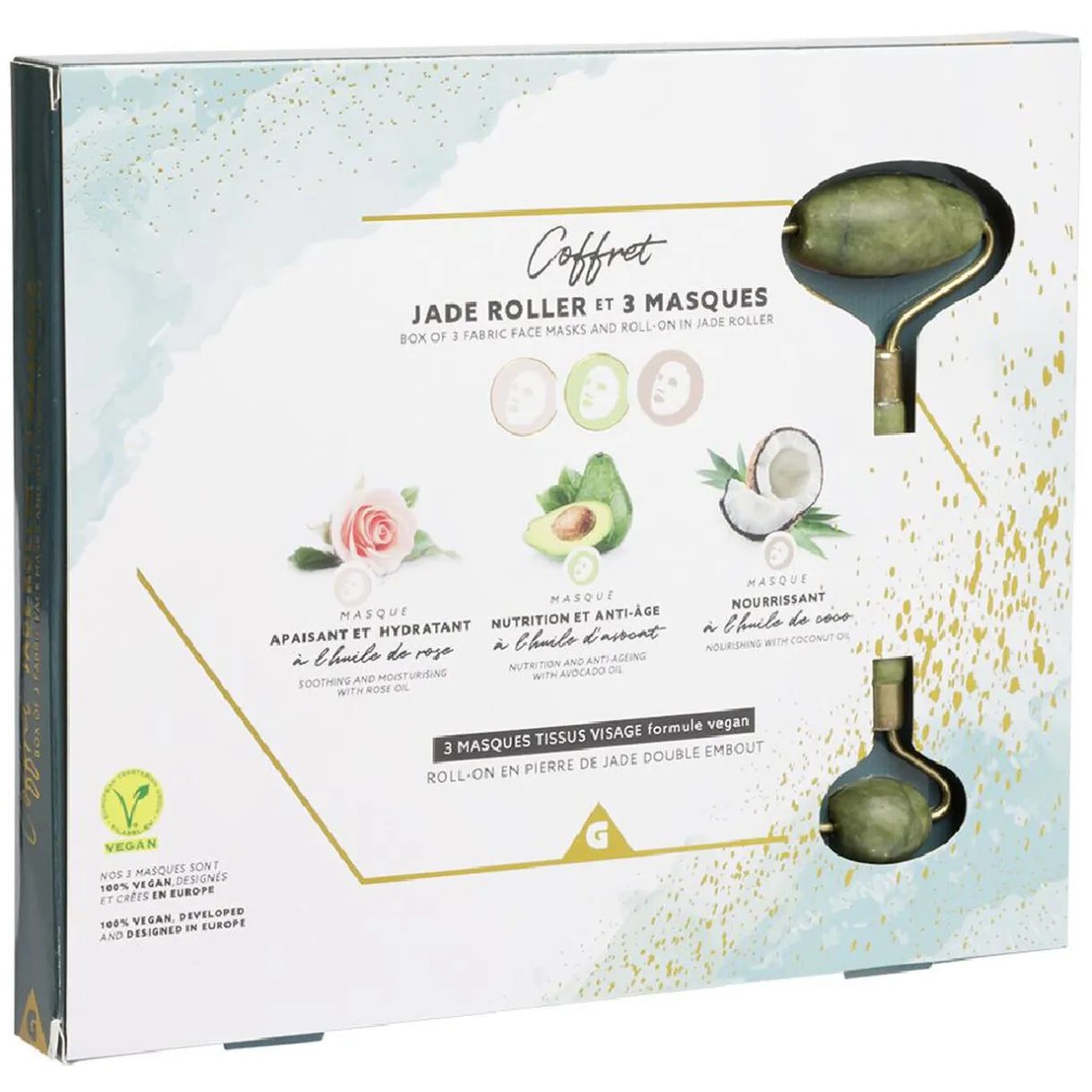 Coffret beauté comprenant 3 masques Vegan et 1 roll-on en pierre de jade à double-embout.