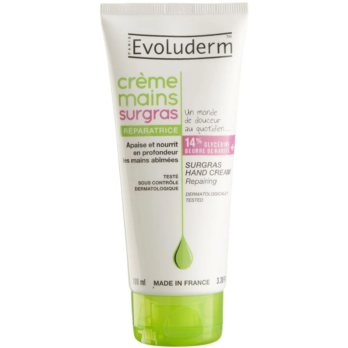 Crème réparatrice pour les mains Evoluderm surgras. Composée de 14% de glycérine et de beurre de karité, elle apaise et nourrit en profondeur les mains sèches et abîmées.