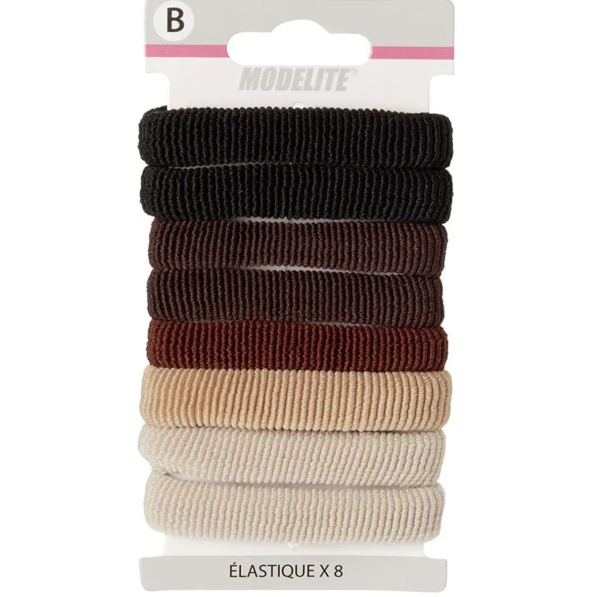 Lot de 6 élastiques en mousse de couleur noir, marron beige clair et beige foncé.