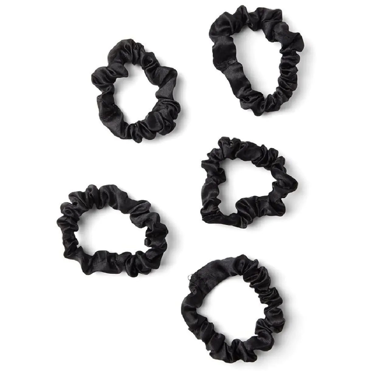 Lot de 5 chouchous scrunchies en polyester satiné noir, un accessoire polyvalent pour coiffer vos cheveux avec style.