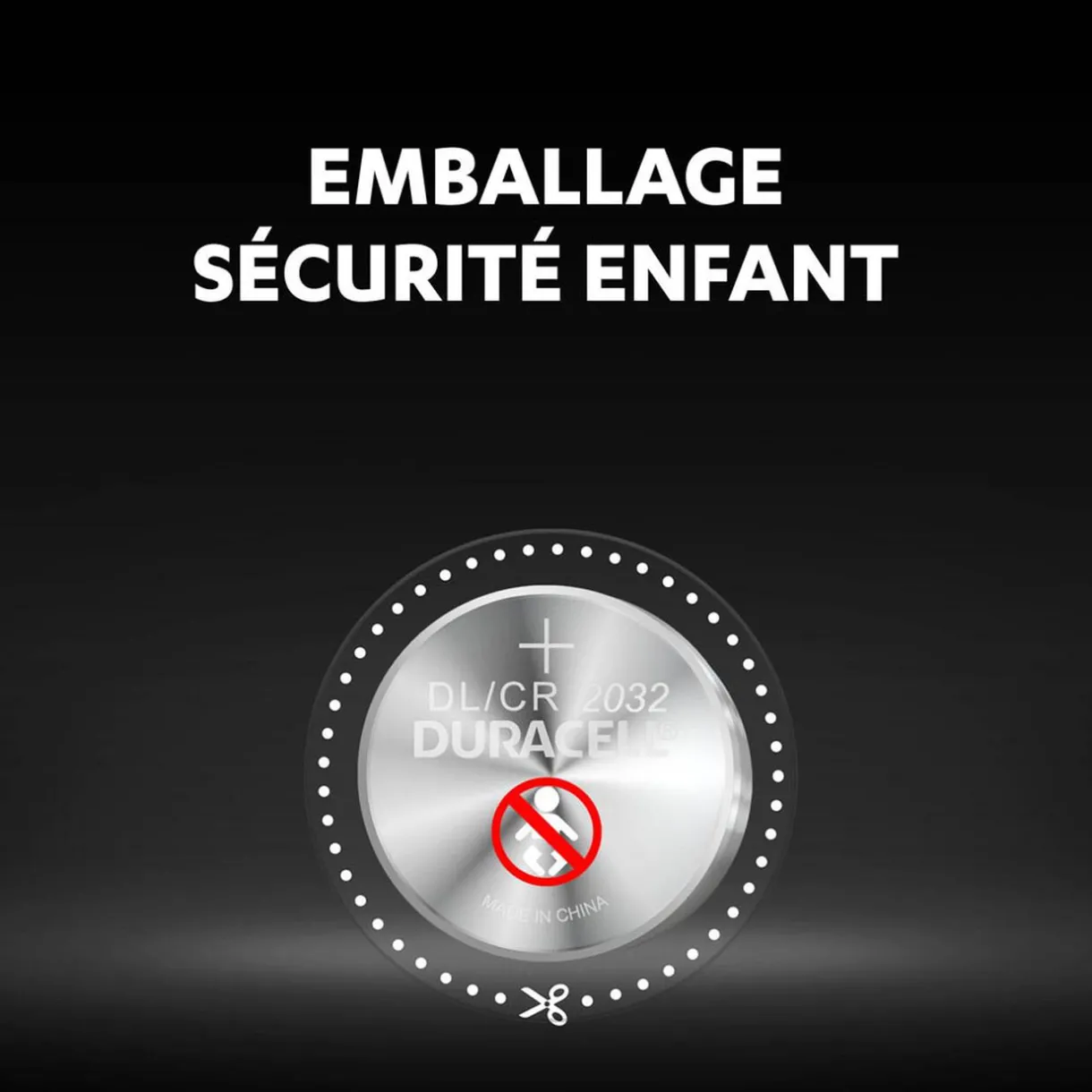 Les piles boutons spécial lithium Duracell offrent jusqu’à 50 % de puissance supplémentaire (par rapport à la durée moyenne minimum des tests standard IEC pour les piles bouton CR2032. Les résultats peuvent varier selon les appareils et modes d’utilisation).