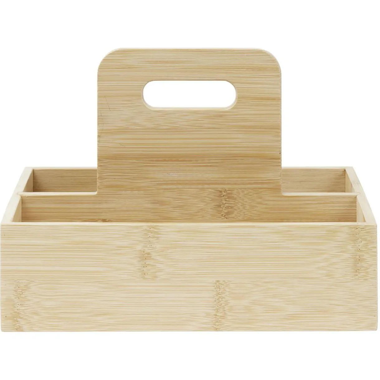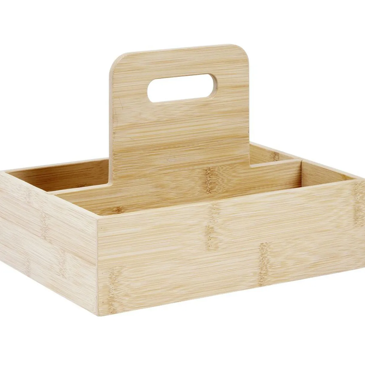 Bac de rangement en bambou à 2 compartiments avec poignée de transport. Idéal pour ranger et transporter facilement des fournitures, du matériel créatif ou de couture.