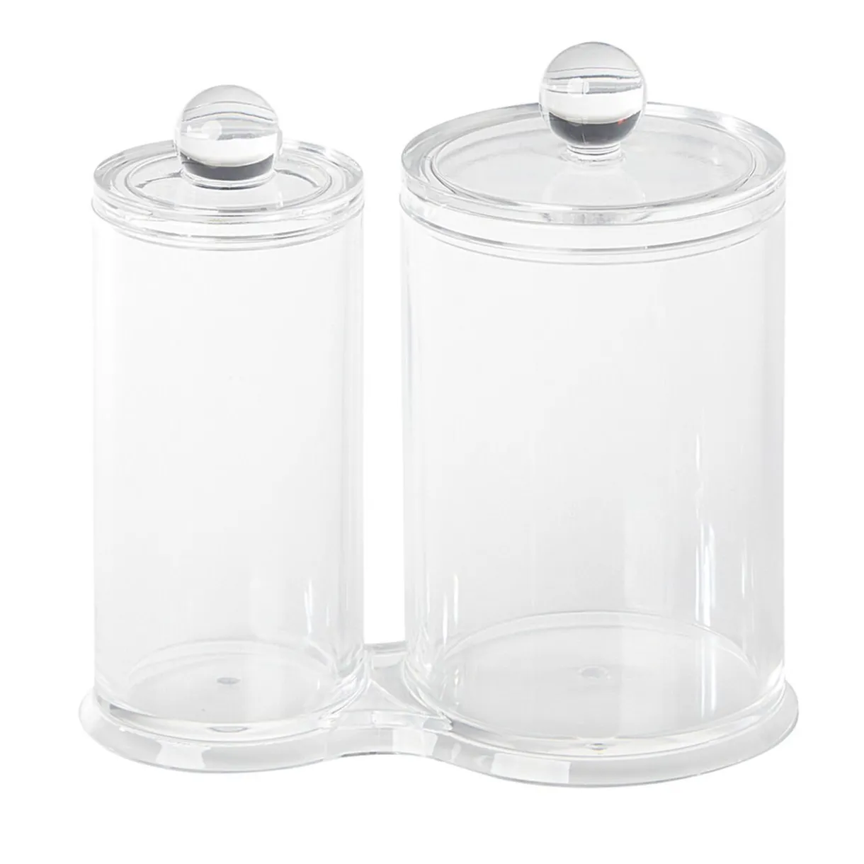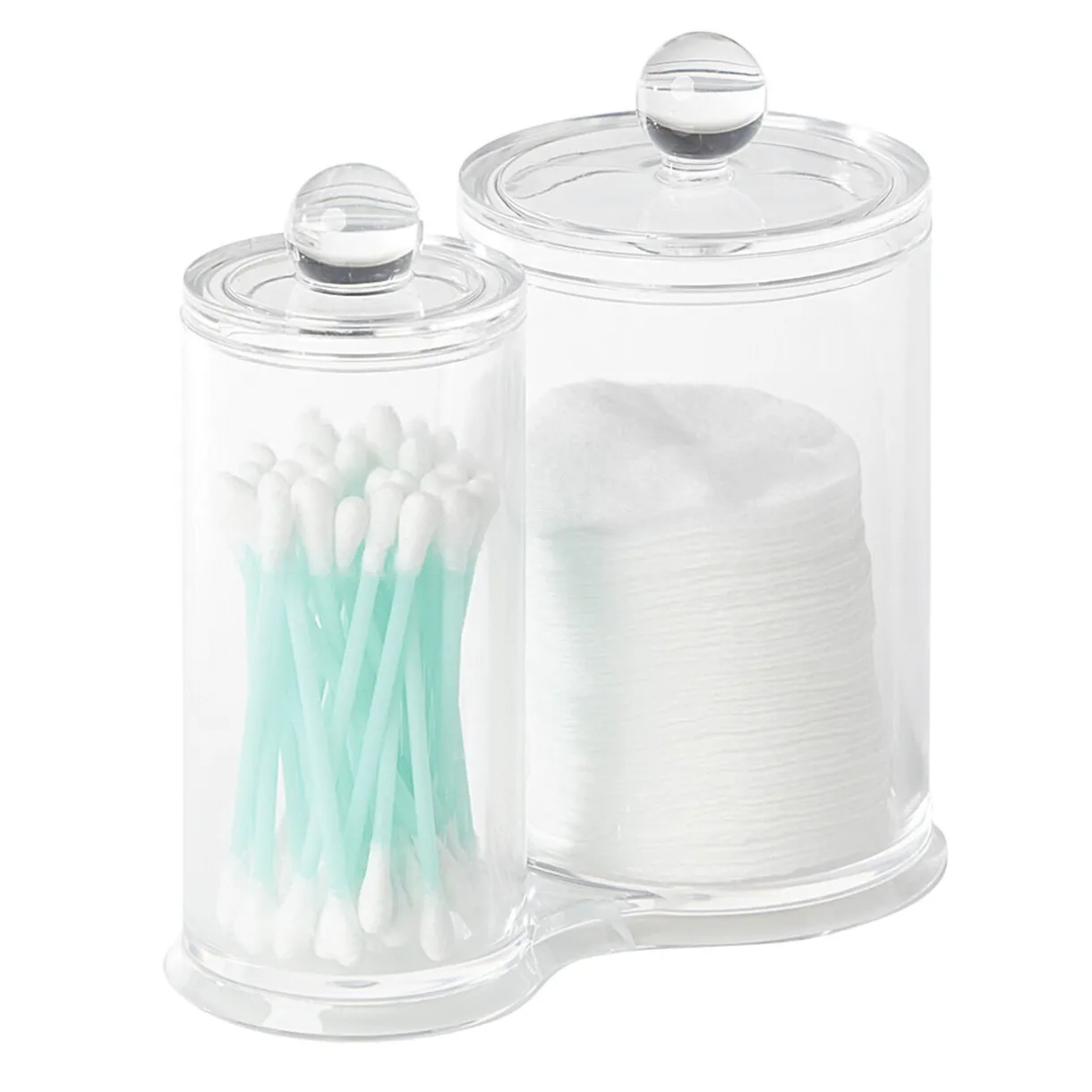 Range coton transparents avec deux éléments fixes pour y ranger vos disques de coton et vos cotons-tiges. Idéals pour optimiser le rangement de votre salle de bain !