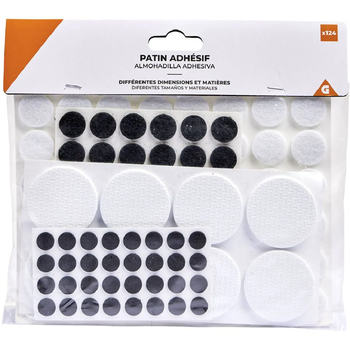 Set de 124 patins adhésifs de différentes tailles et matières :