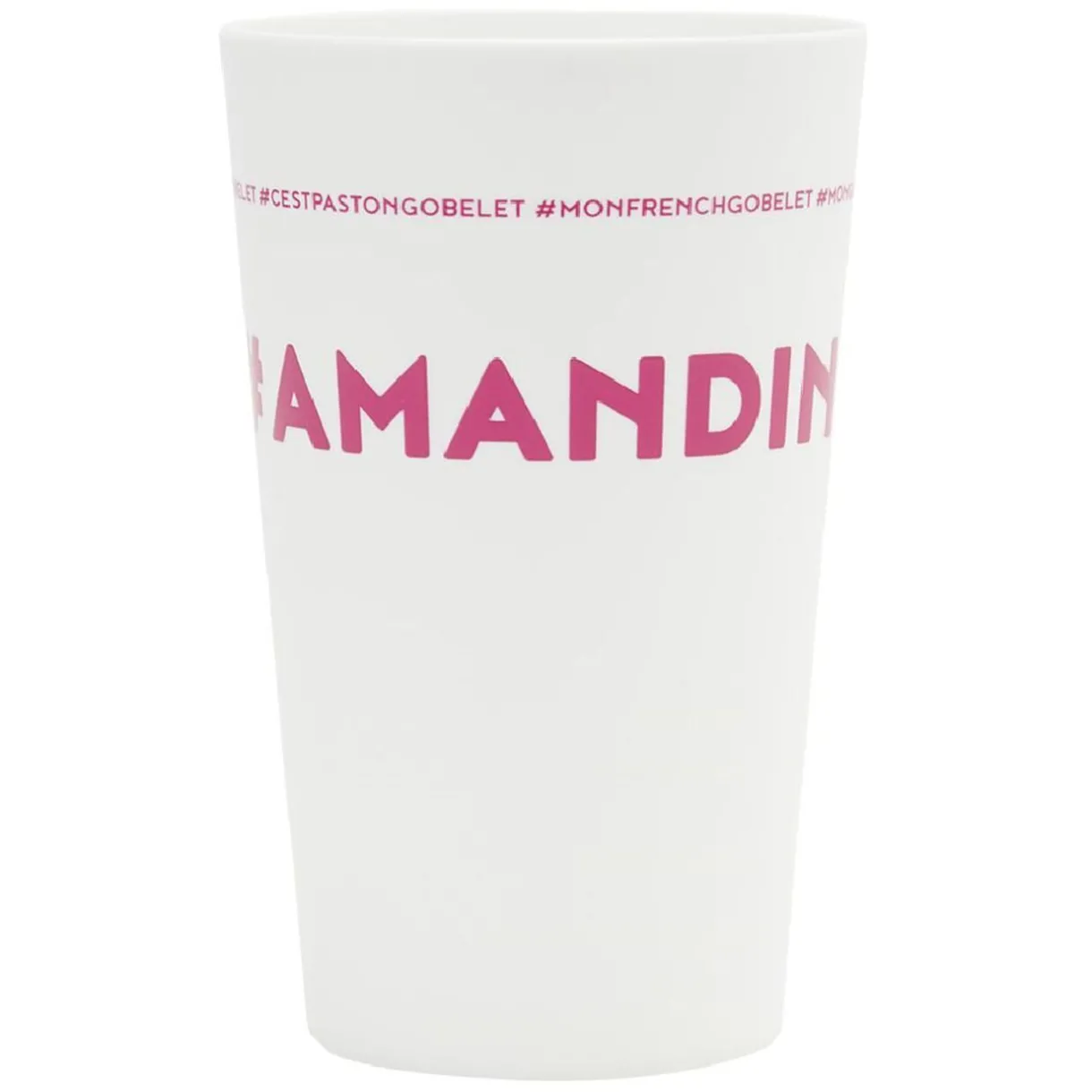 Gobelet réutilisable en plastique blanc avec inscription rose #AMANDINE.
