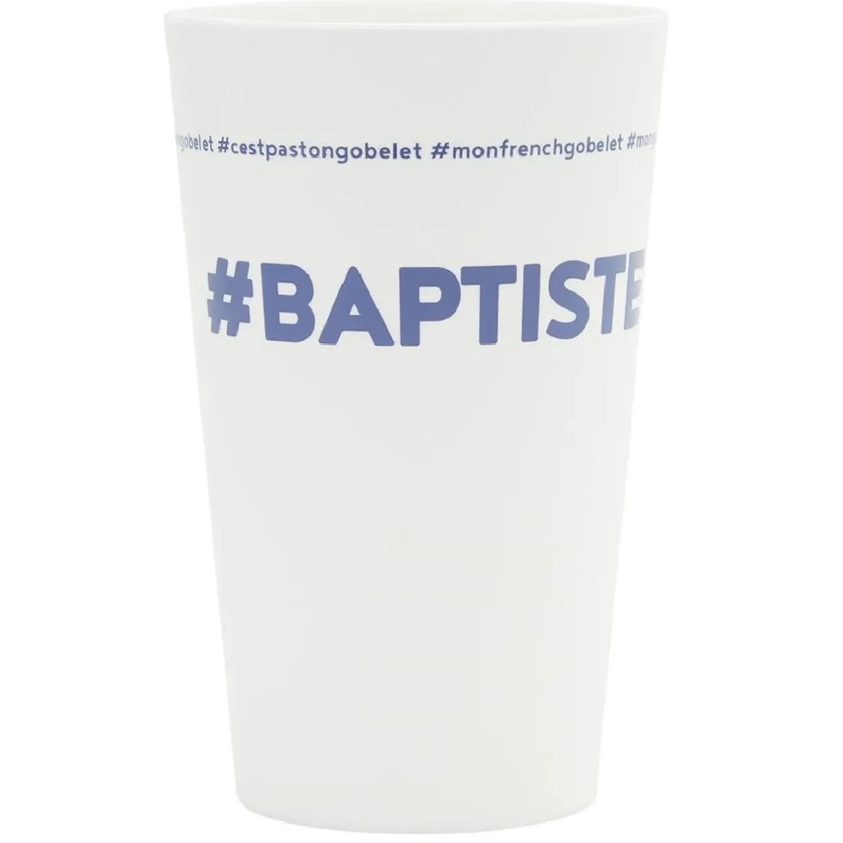 Gobelet réutilisable en plastique blanc avec inscription bleue #BAPTISTE.