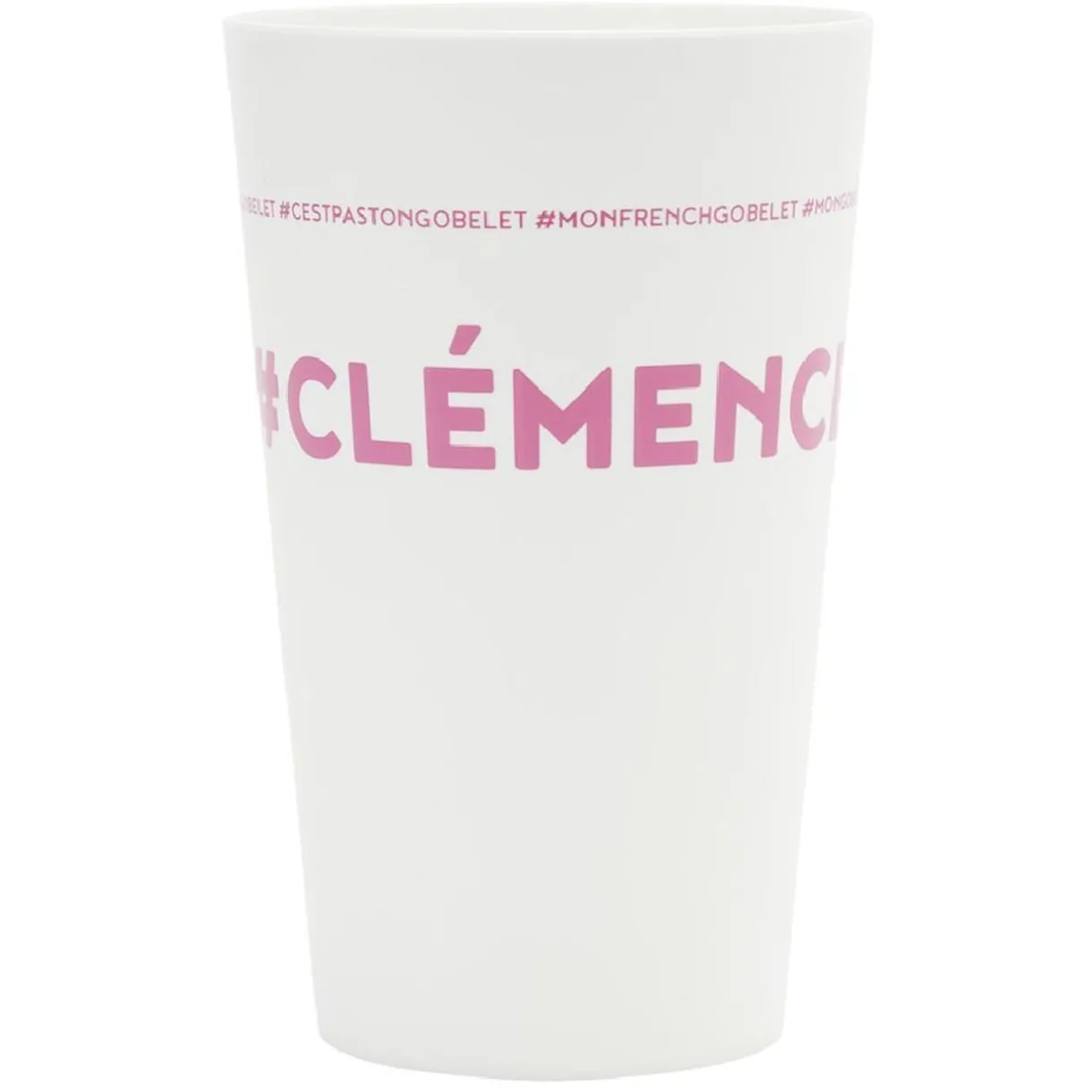 Gobelet réutilisable en plastique blanc avec inscription rose #CLÉMENCE.
