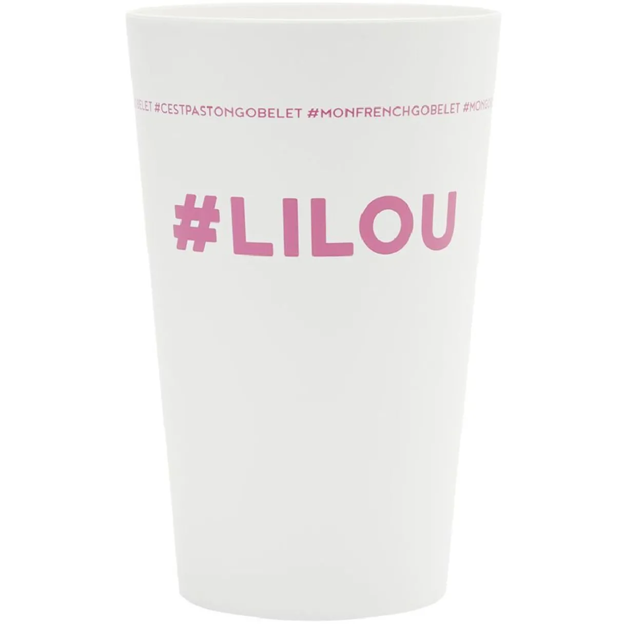 Gobelet réutilisable en plastique blanc avec inscription rose #LILOU.