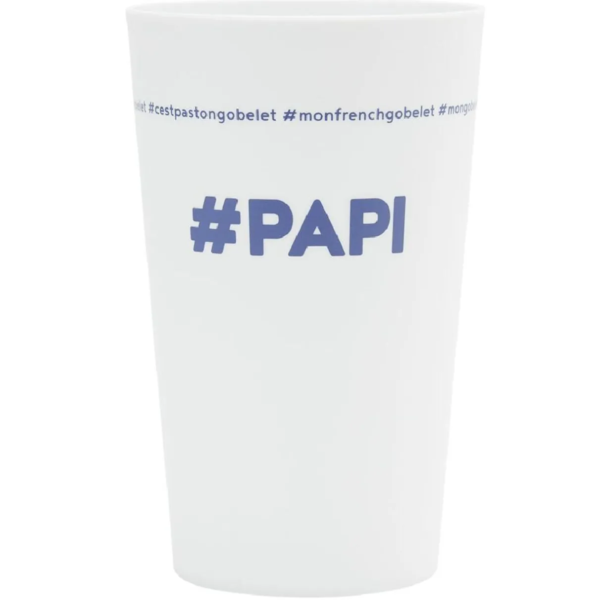 Gobelet réutilisable en plastique blanc avec inscription bleue #PAPI.