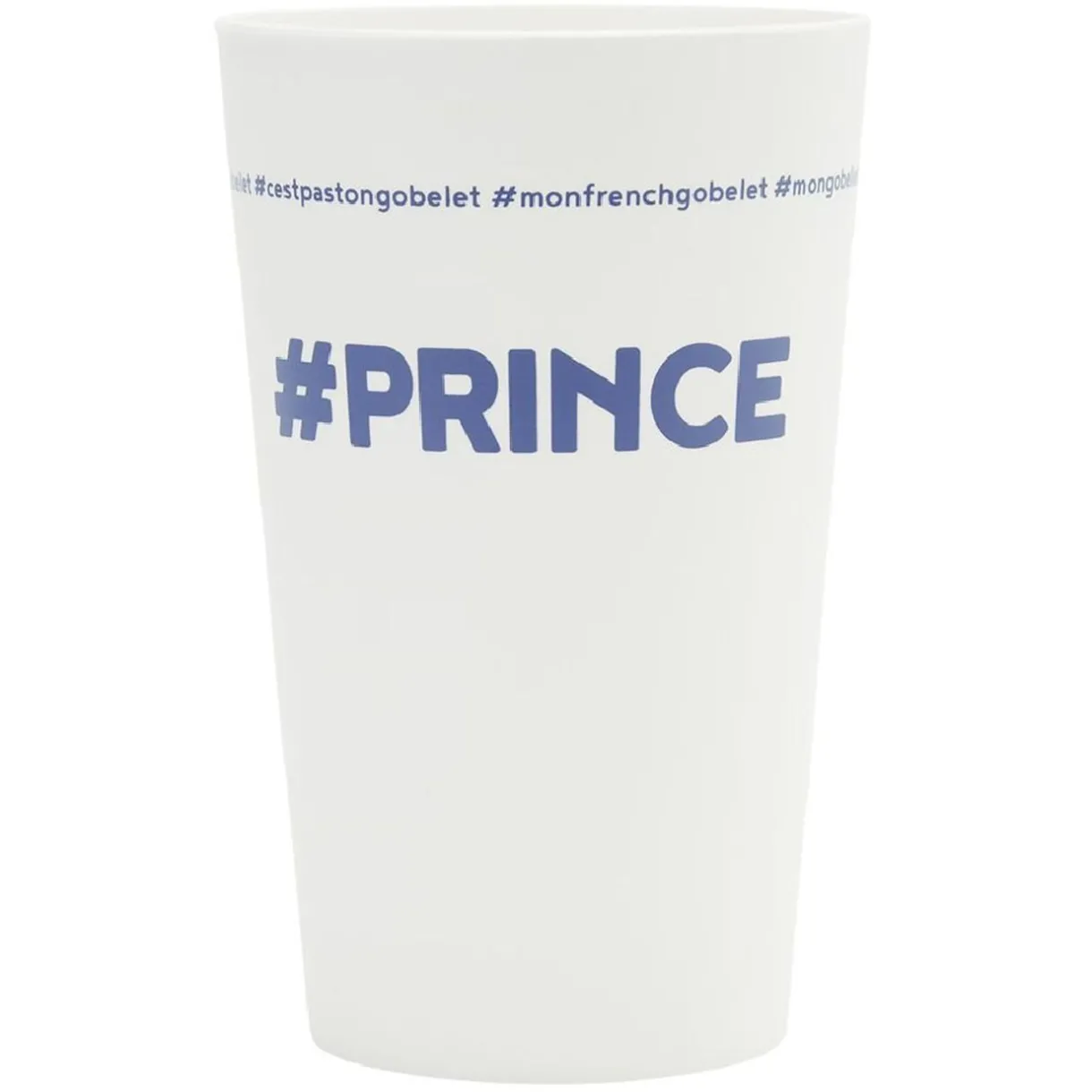 Gobelet réutilisable en plastique blanc avec inscription bleue #PRINCE.