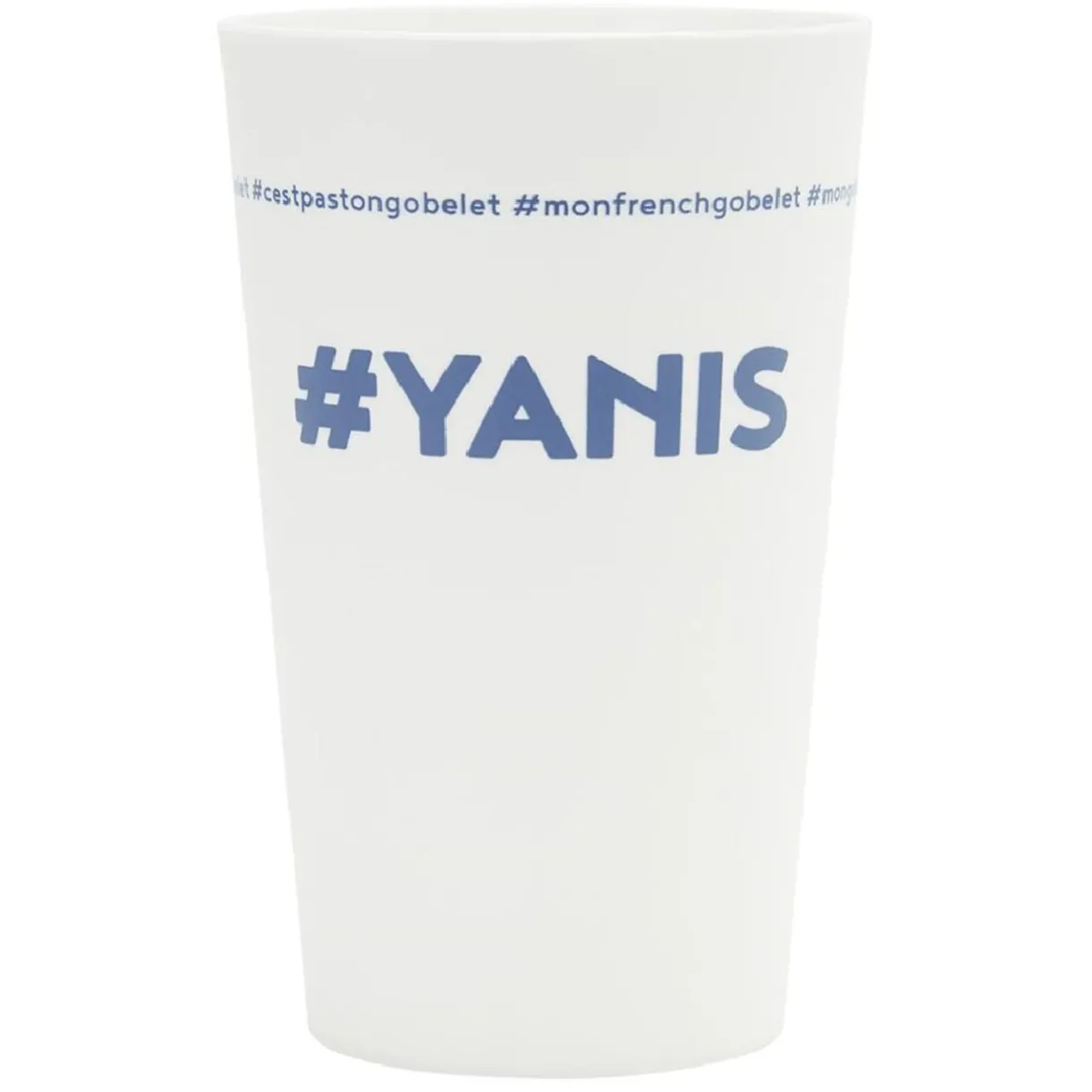 Gobelet réutilisable en plastique blanc avec inscription bleue #YANIS.