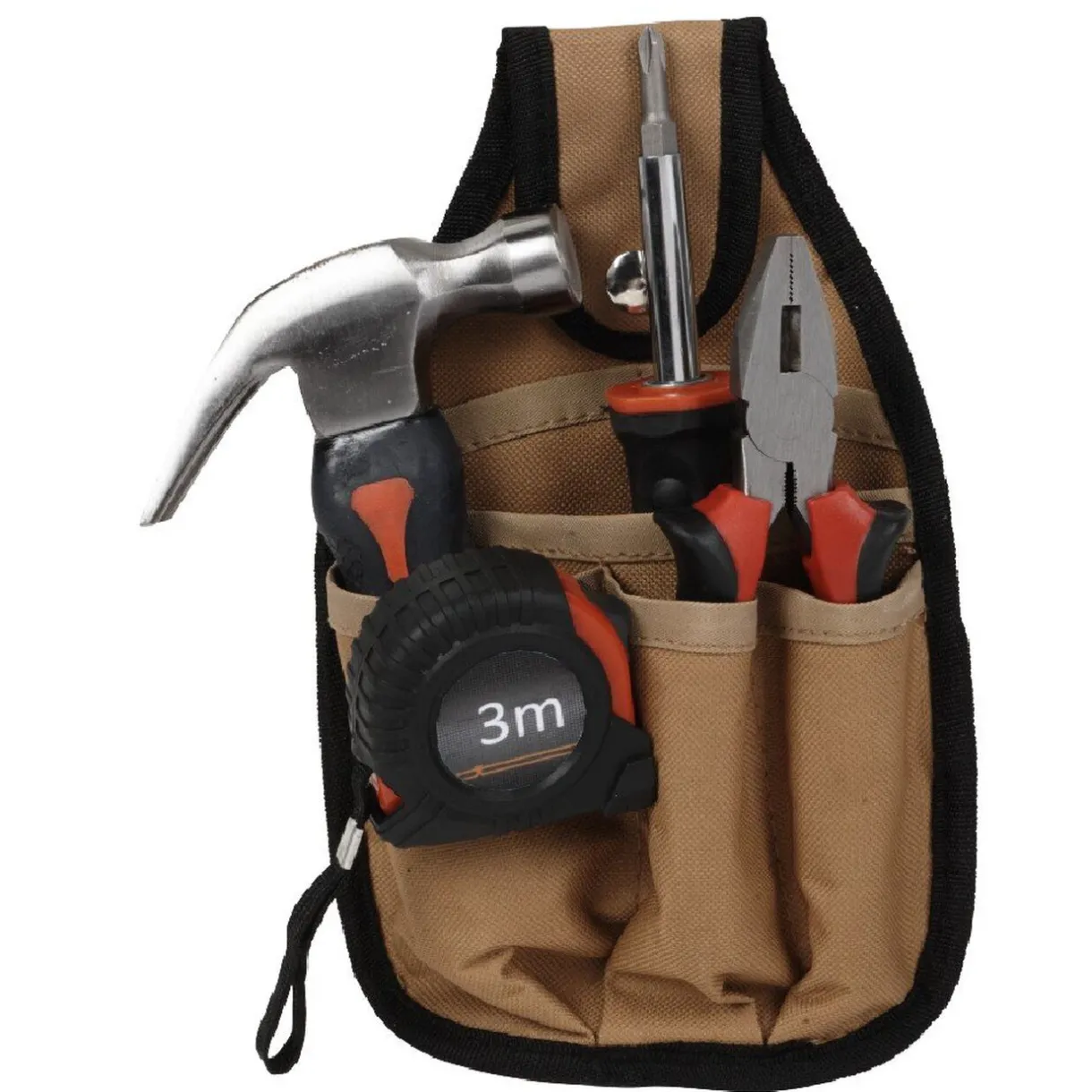 Ceinture de bricolage comprenant 1 mètre, 1 tournevis 2 embouts, 1 marteau et 1 pince universelle.