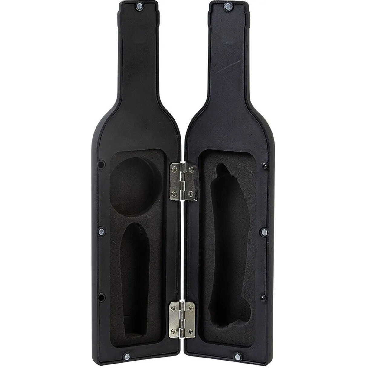 Coffret en forme de bouteille de vin comprenant 3 accessoires d’oenologie: un tire-bouchon, un bouchon de dosage et une bague anti-goutte.