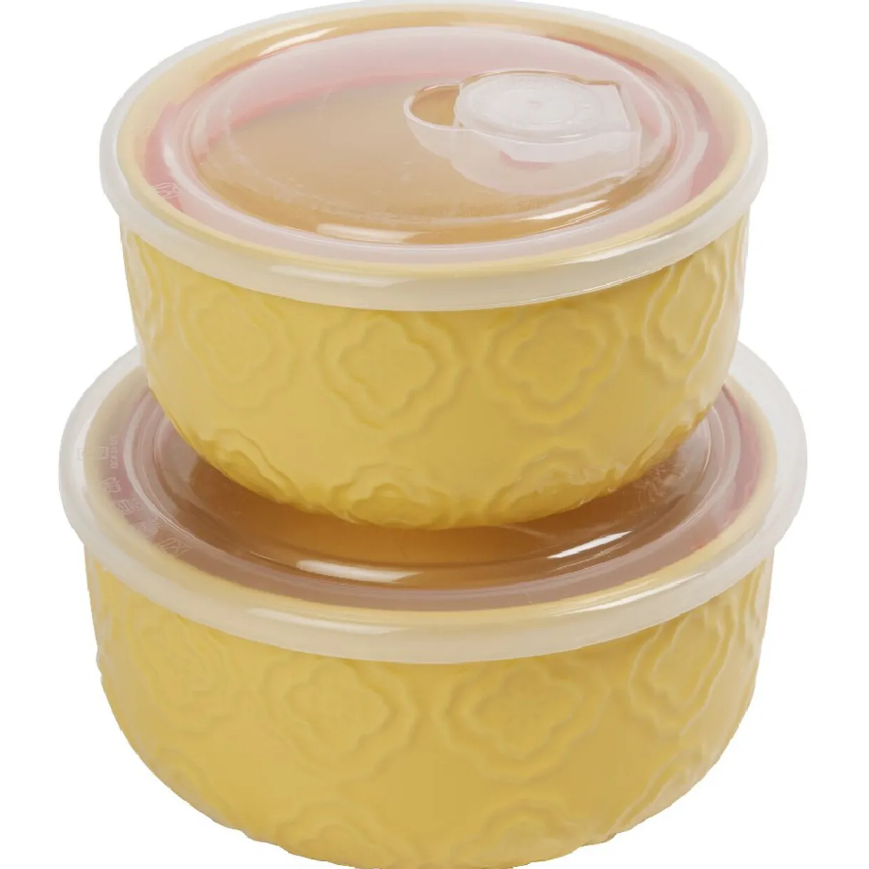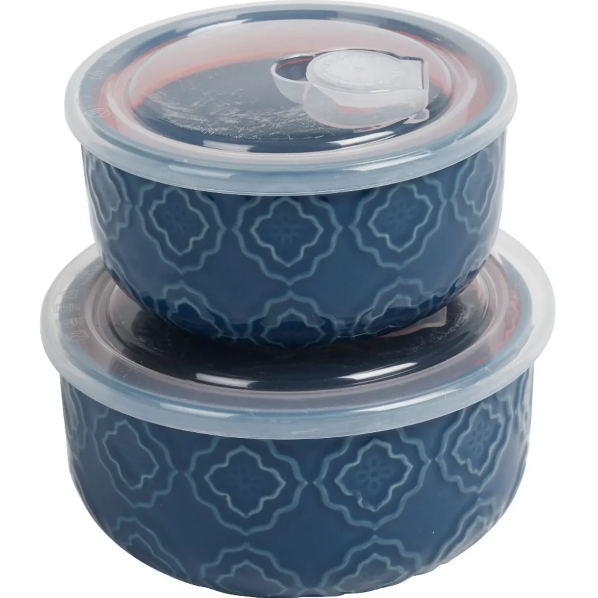Lot de 2 boites alimentaires. Ce produit existe en 4 coloris, modèle aléatoire selon disponibilité en magasin – Couleur : bleu, vert, jaune, orange – Dimensions : Ø 15 x H.7 cm – Matière : céramique
