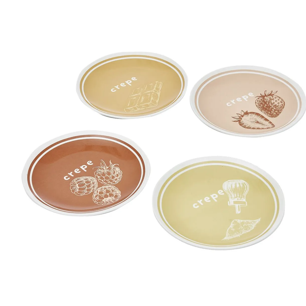 Lot de 4 assiettes rondes en faïence design crêpes avec petits motifs imprimés pour de délicieux goûters sucrés.