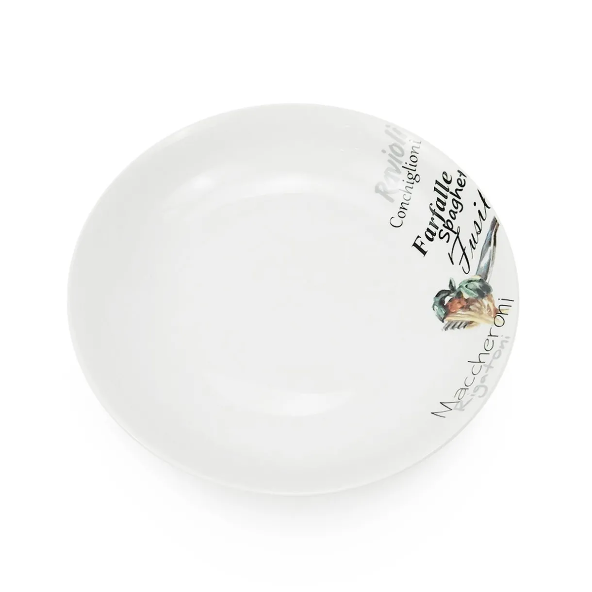 Lot de 4 assiettes à pâtes en porcelaine blanche décorée de diverses inscriptions de noms de pâtes.