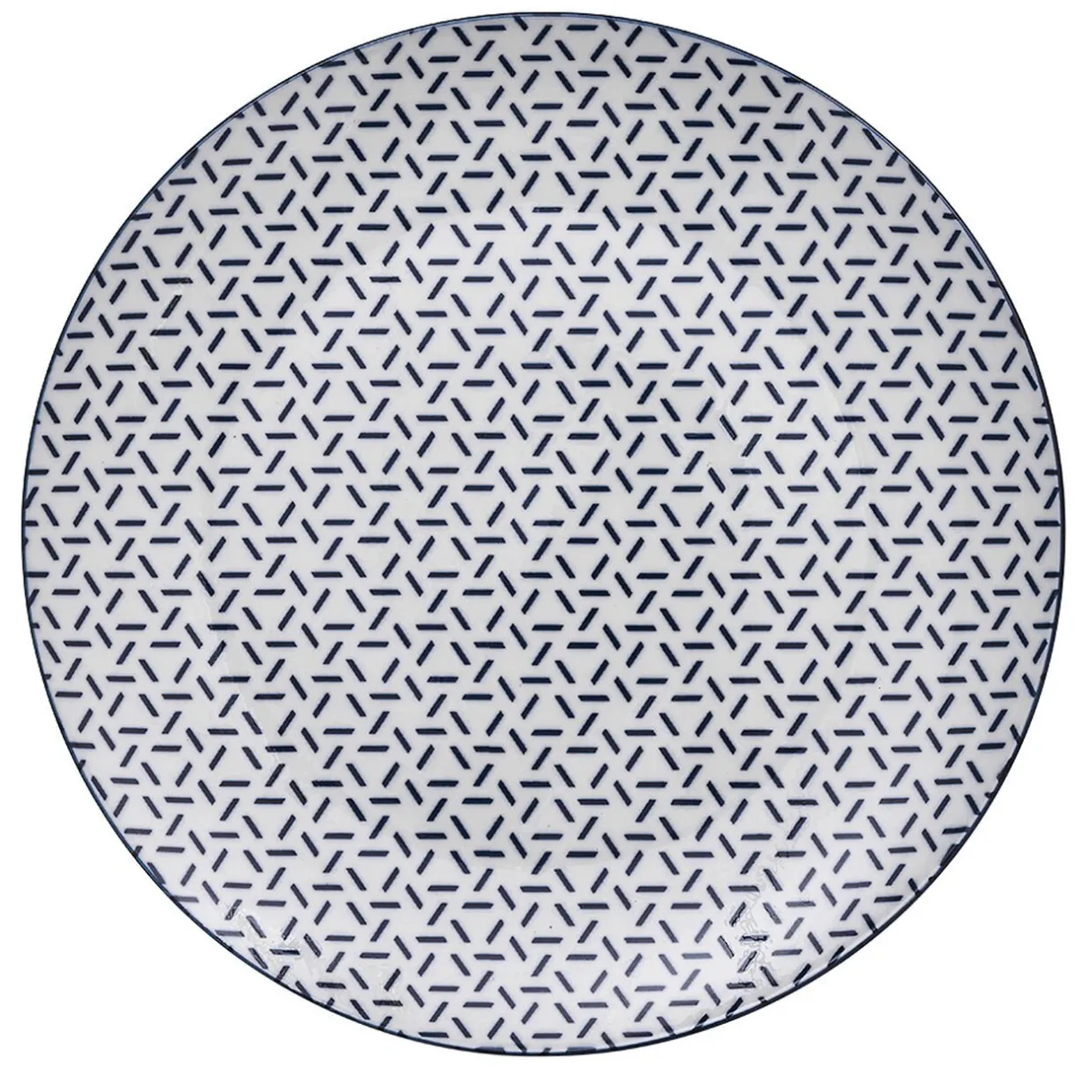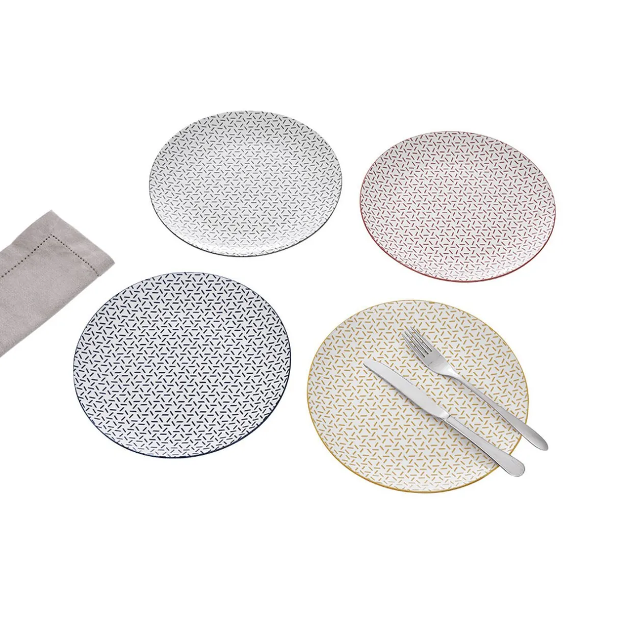 Set de 4 assiettes plates en porcelaine blanche avec contour et motifs petits traits colorés formant des triangles, idéal pour créer des mélanges de couleur sur votre table.