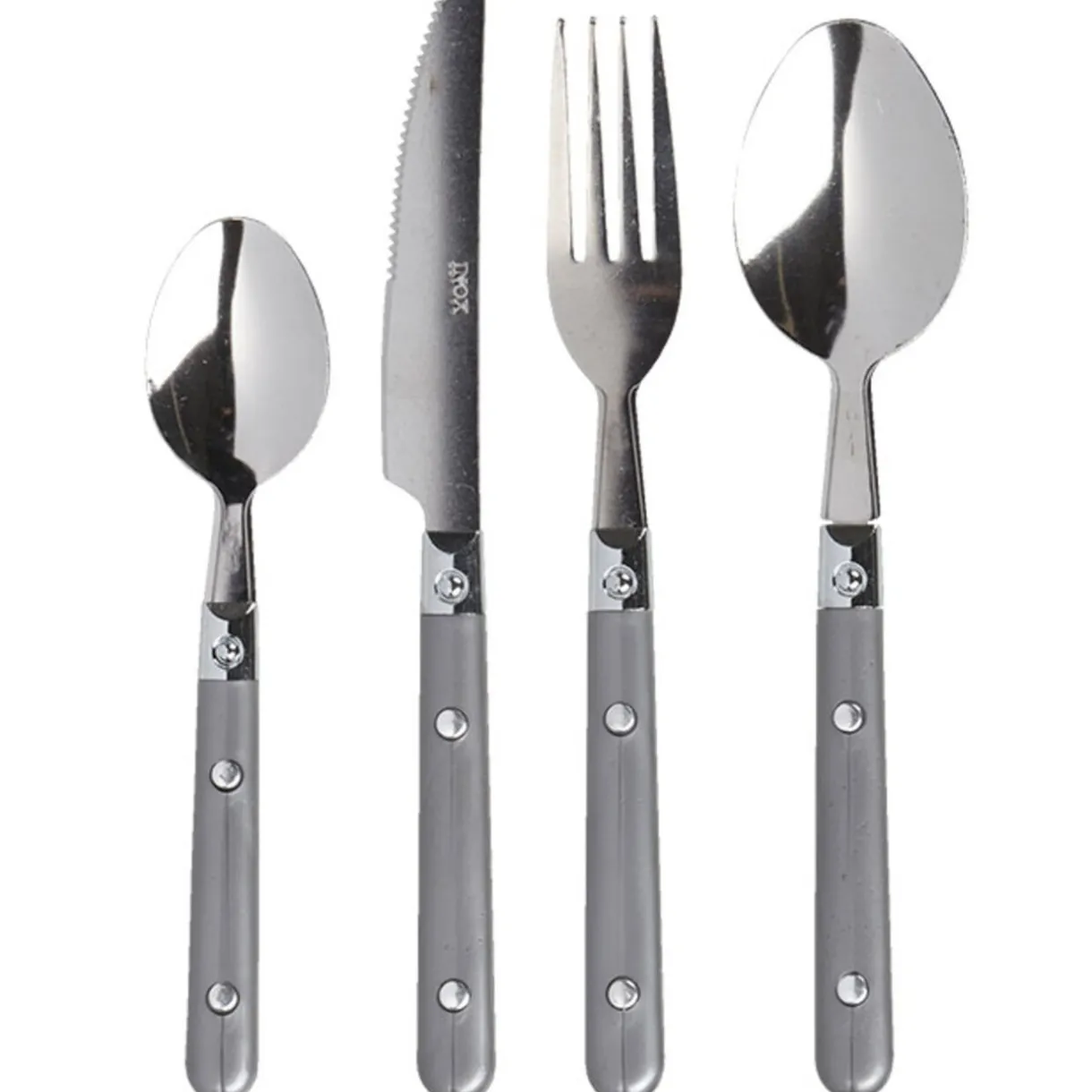 Ménagère 16 pièces gris comprenant 4 fourchettes, 4 cuillères à soupe, 4 couteaux et 4 cuillères à café, inox, manche plastique.