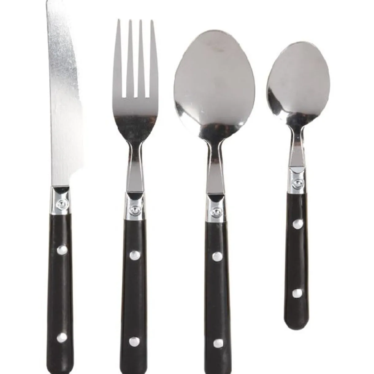 Ménagère composée de 16 pièces en inox avec manche en plastique noir.