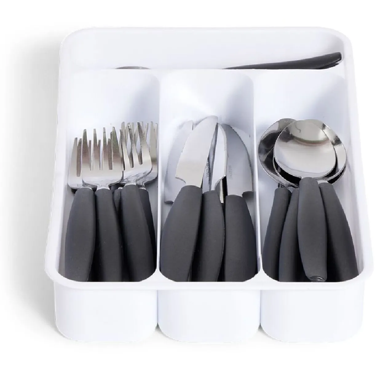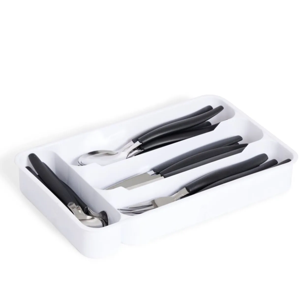 Un range-couverts en plastique blanc, spécialement conçu pour cette ménagère, est inclus pour un stockage facilité et une meilleure organisation.