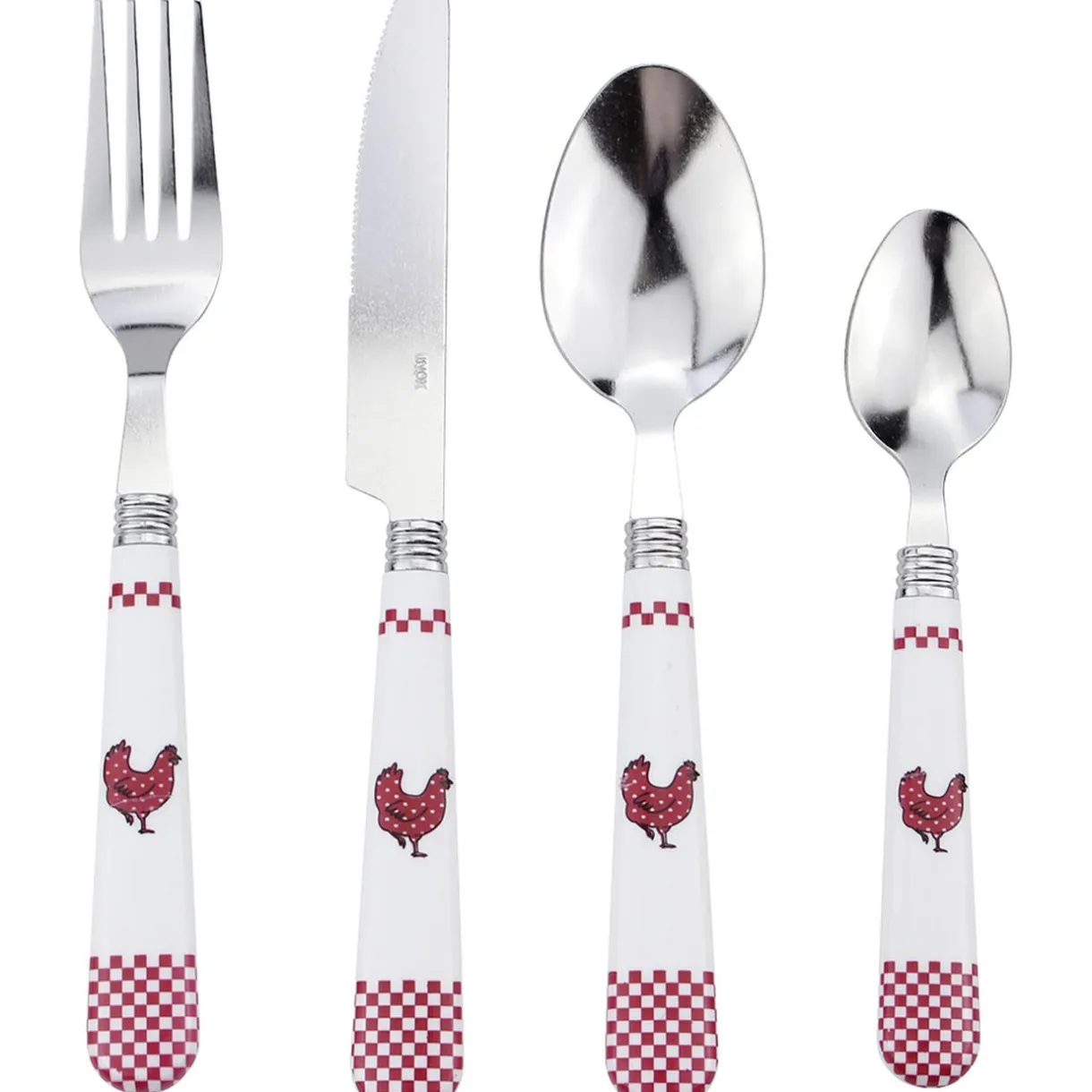 Ménagère de 24 pièces décorées de poules et de quadrillages au coloris rouge et blanc sur le thème de la campagne.