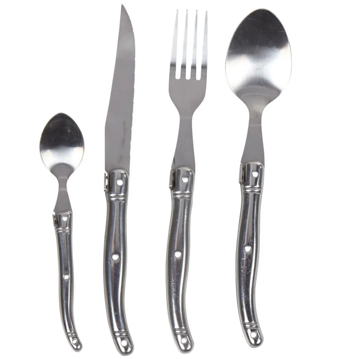 Ménagère grise 24 pièces en inox et manche plastique comprenant : 6 fourchettes, 6 couteaux, 6 cuillères à soupe et 6 cuillères à café.
