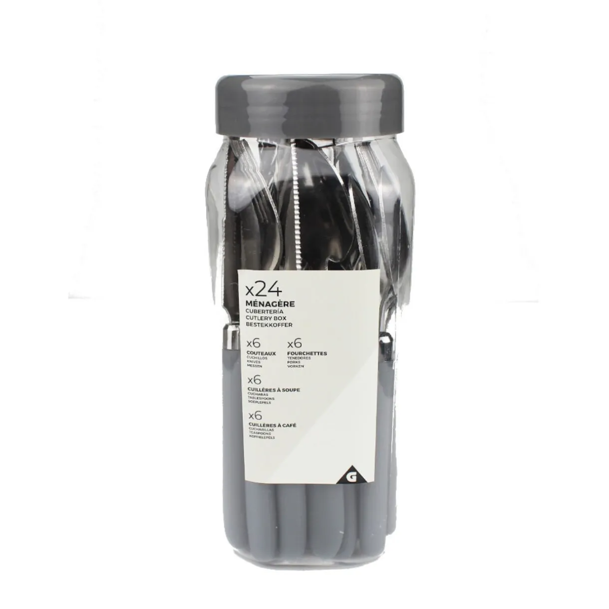 Ménagère composée de 24 couverts en inox avec manche antidérapant en soft touch de couleur grise.