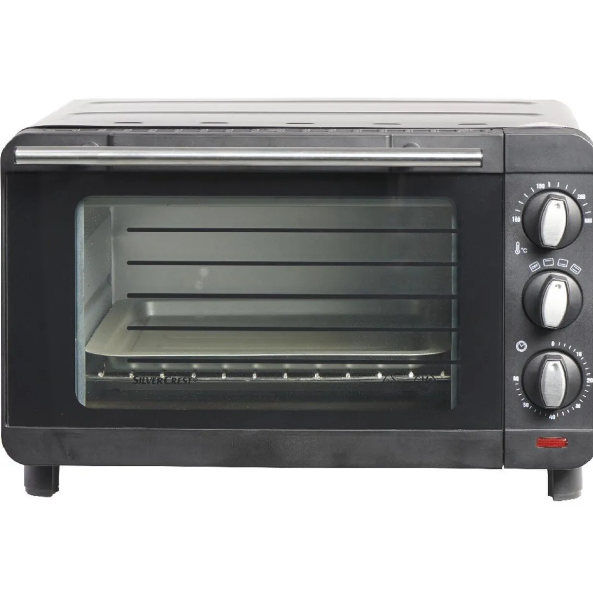 Mini four électrique noir d’une capacité de 14 L avec minuteur, thermosthat et 4 fonctions de cuisson. Inclus grille en inox et plateau.