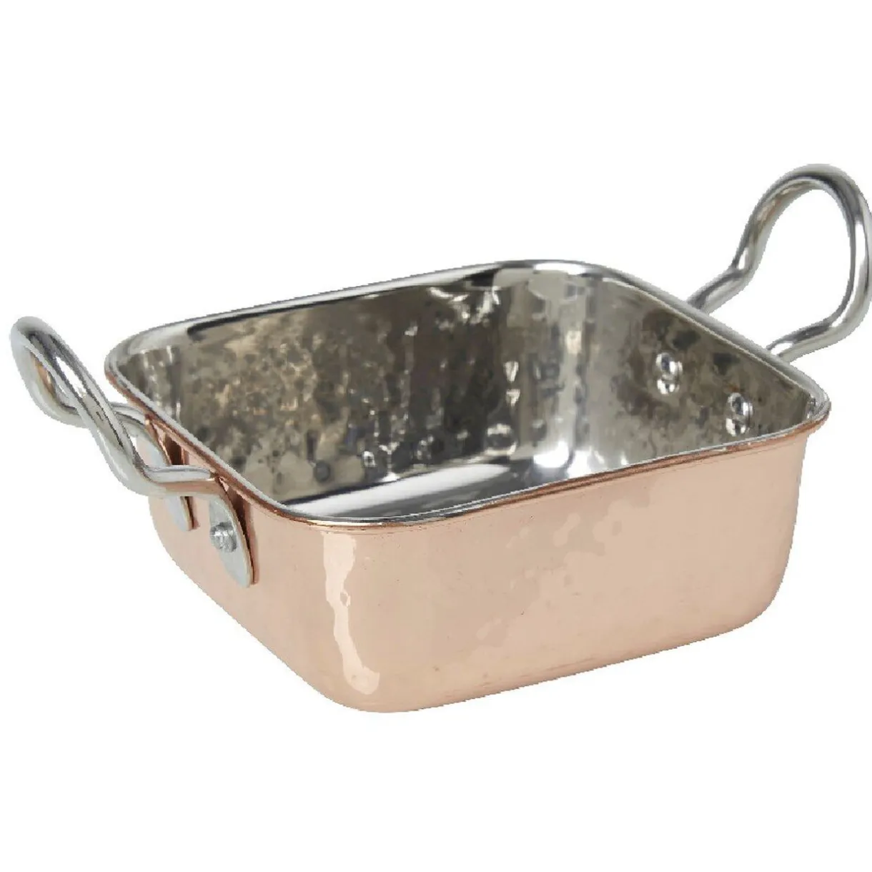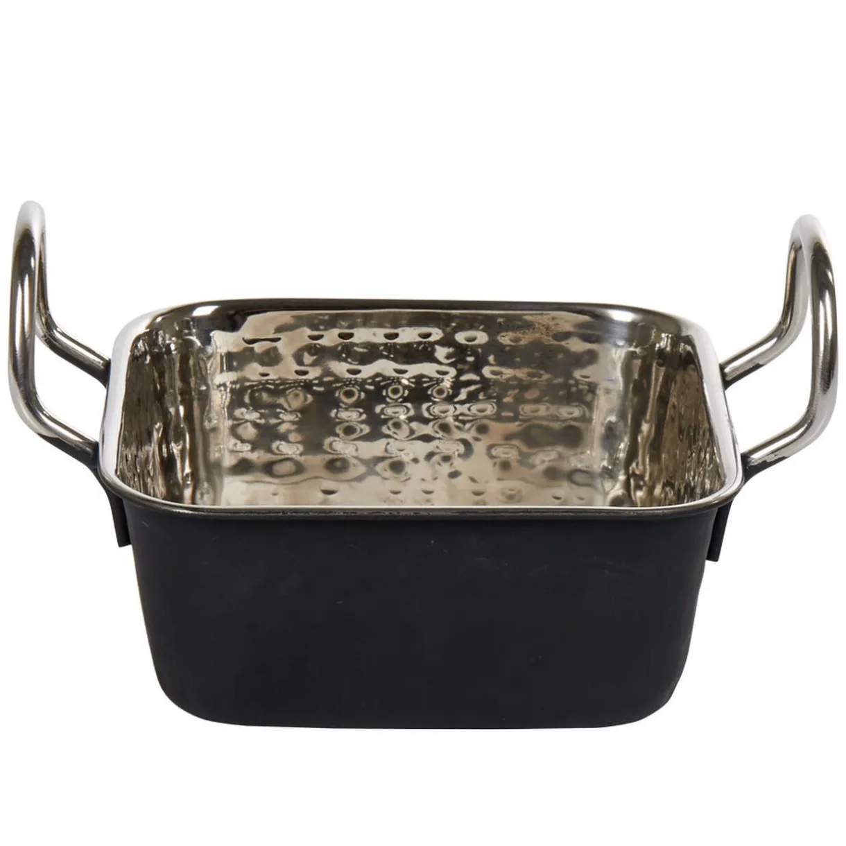 Mini plat à four carré avec poignées de couleur noir ou cuivre à l’extérieur et argenté à l’intérieur.