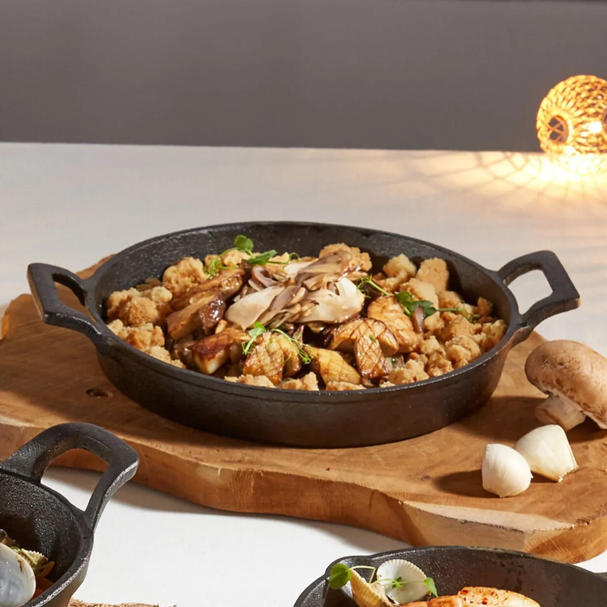 Min plat à four rond en fonte avec poignées et revêtement anti-adhésif.