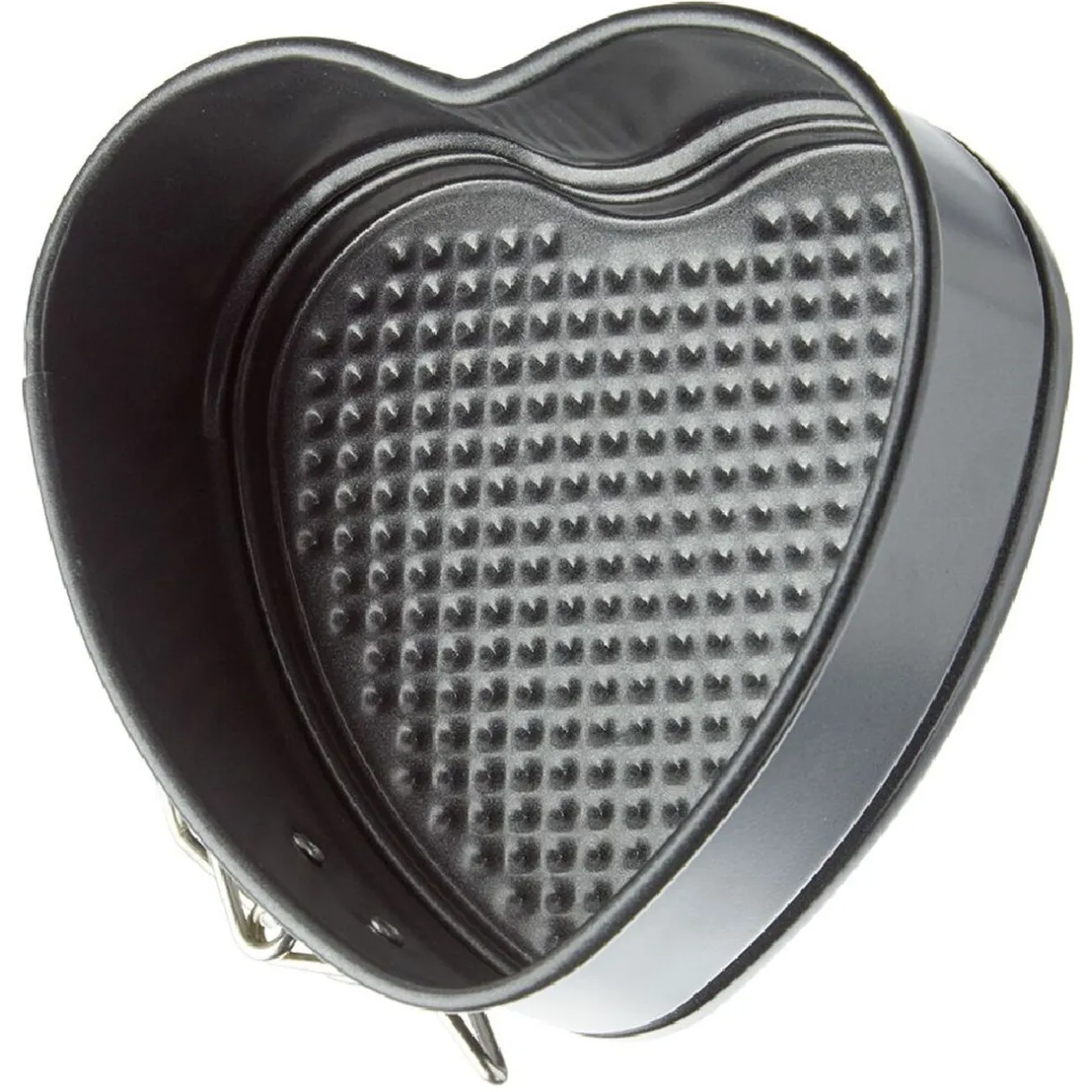 Moule à gâteau forme coeur en métal gris avec système d’ouverture/fermeture à charnière pour un démoulage facile.