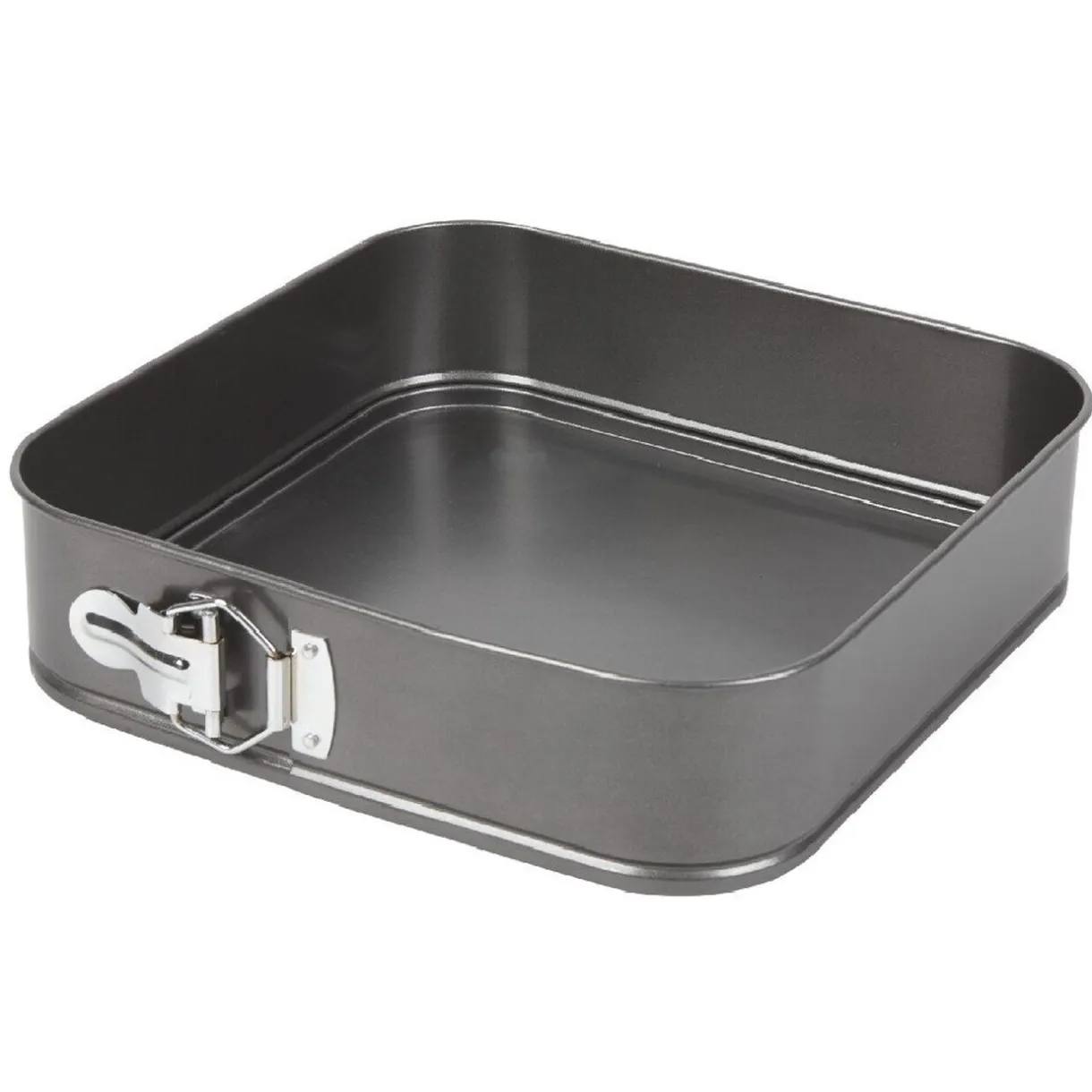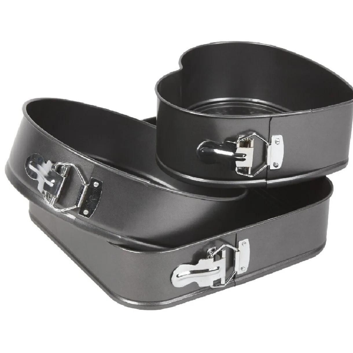 3 moules à gâteau à charnière, 1 coeur dim. 20x22x8 cm, 1 rond Ø 24 cm, 1 carré dim. 26x26x7 cm, acier.