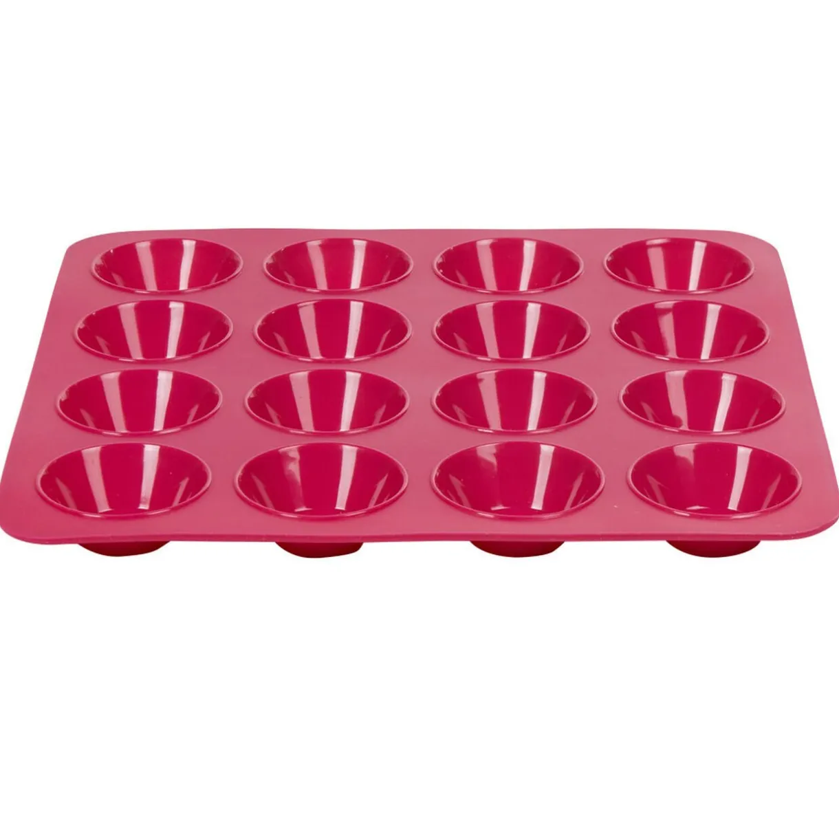 Moule carré en silicone de couleur rose avec empreintes pour la cuisson de 16 petits fours.