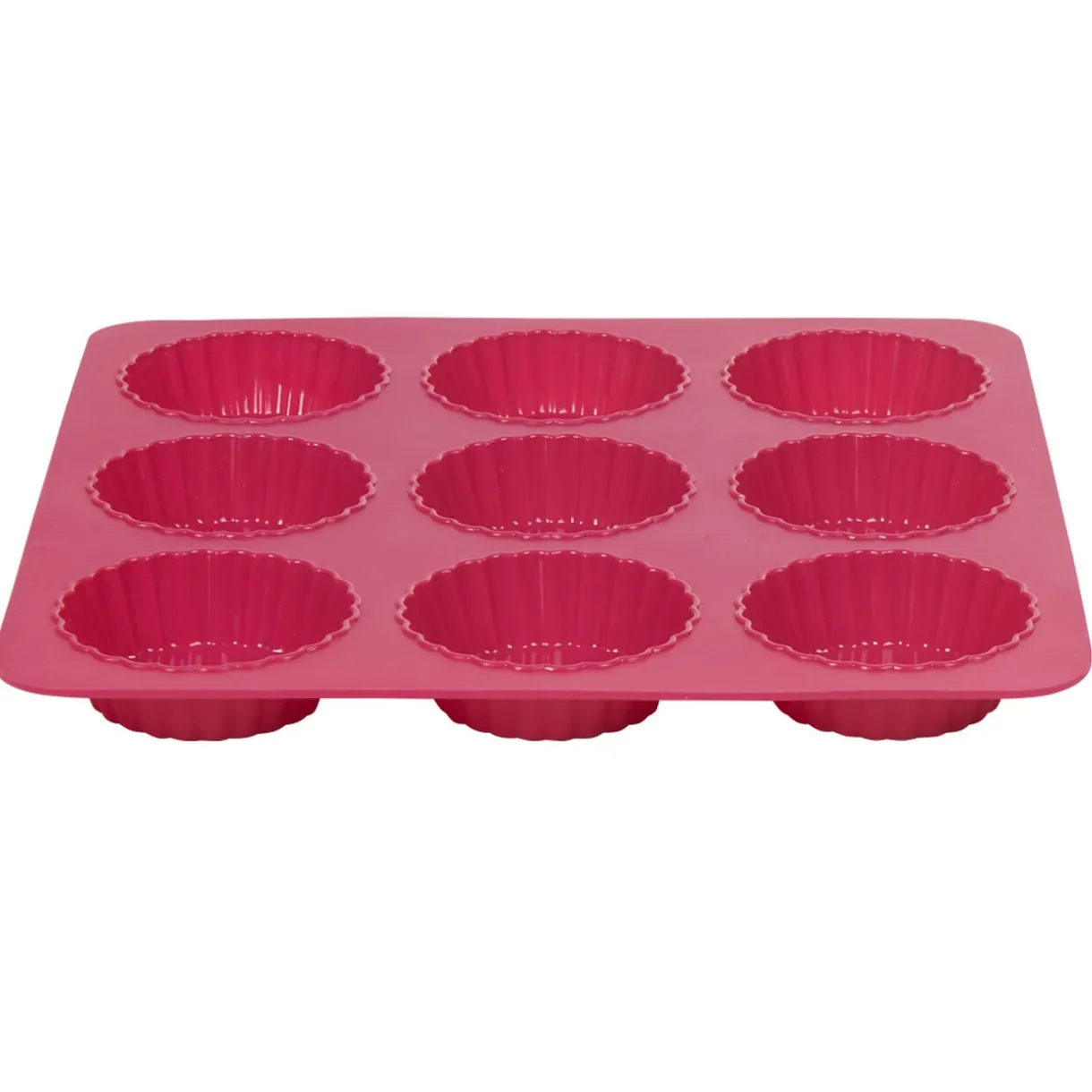 Moule carré en silicone de couleur rose avec 9 empreintes rondes pour la cuisson de 9 délicieuses tartelettes.