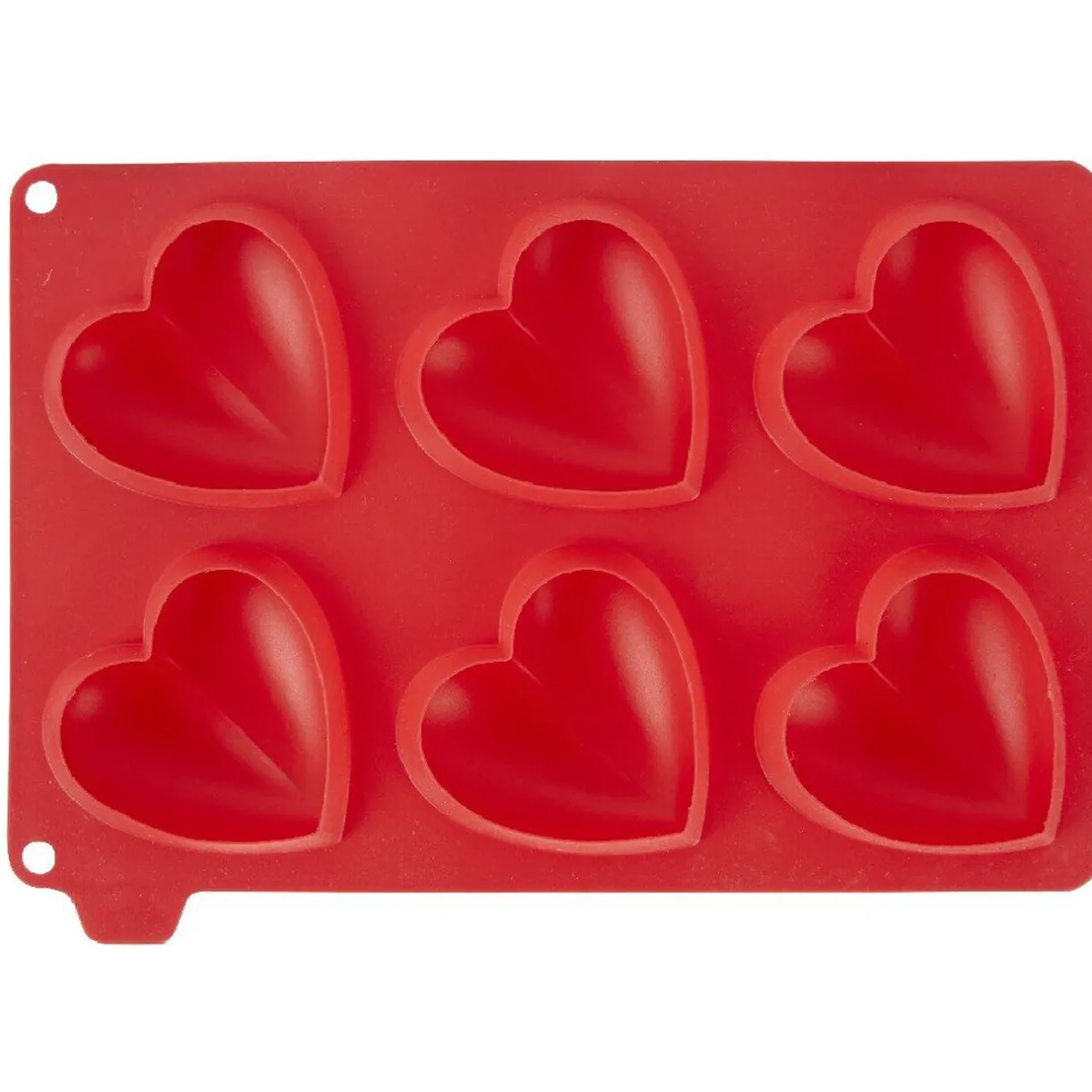 Moule rectangulaire en silicone rouge pour la cuisson de 6 pâtisseries individuelles en forme de coeur.