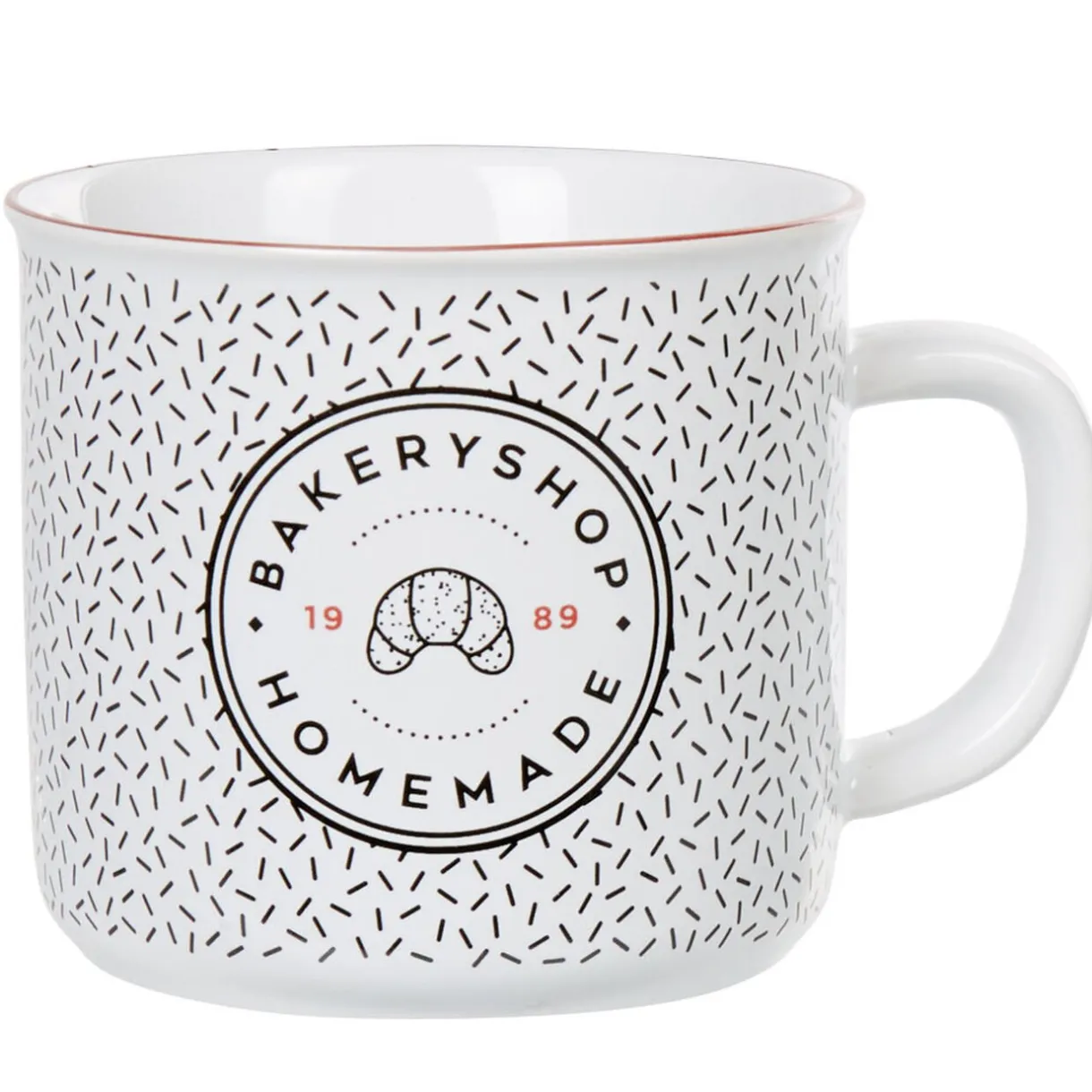 Mug déco avec fond décoré, liseré rouge et macaron avec un croissant et les inscriptions « bakery shop » (boulangerie) et « homemade » (fait maison).