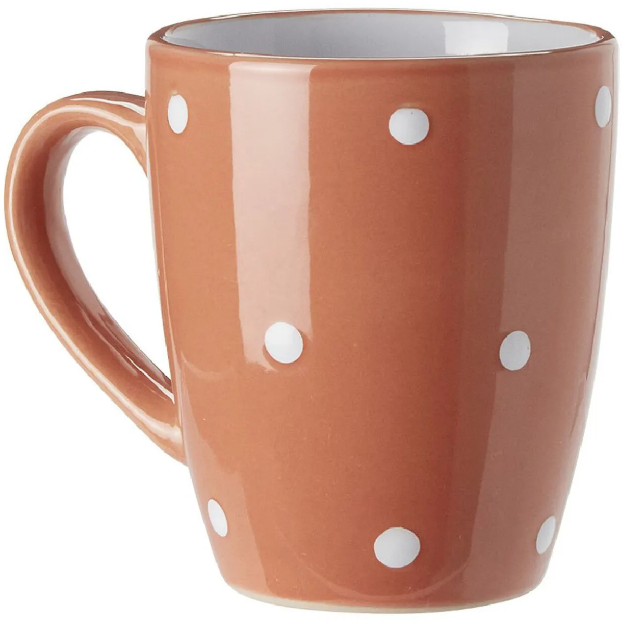 Set de 4 mugs en faïence de couleur beige, grise, jaune et corail avec motif pois blancs.