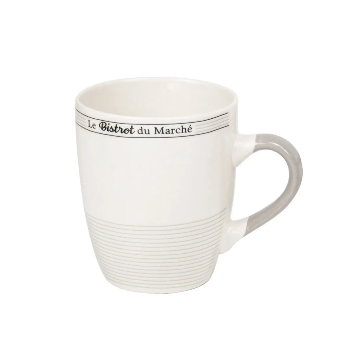 Optez pour ce mug en porcelaine blanche avec liserés noirs et inscription déco « LeBistrot du Marché ». Idéale pour dresser une belle table de petit-déjeuner au style convivial et authentique!