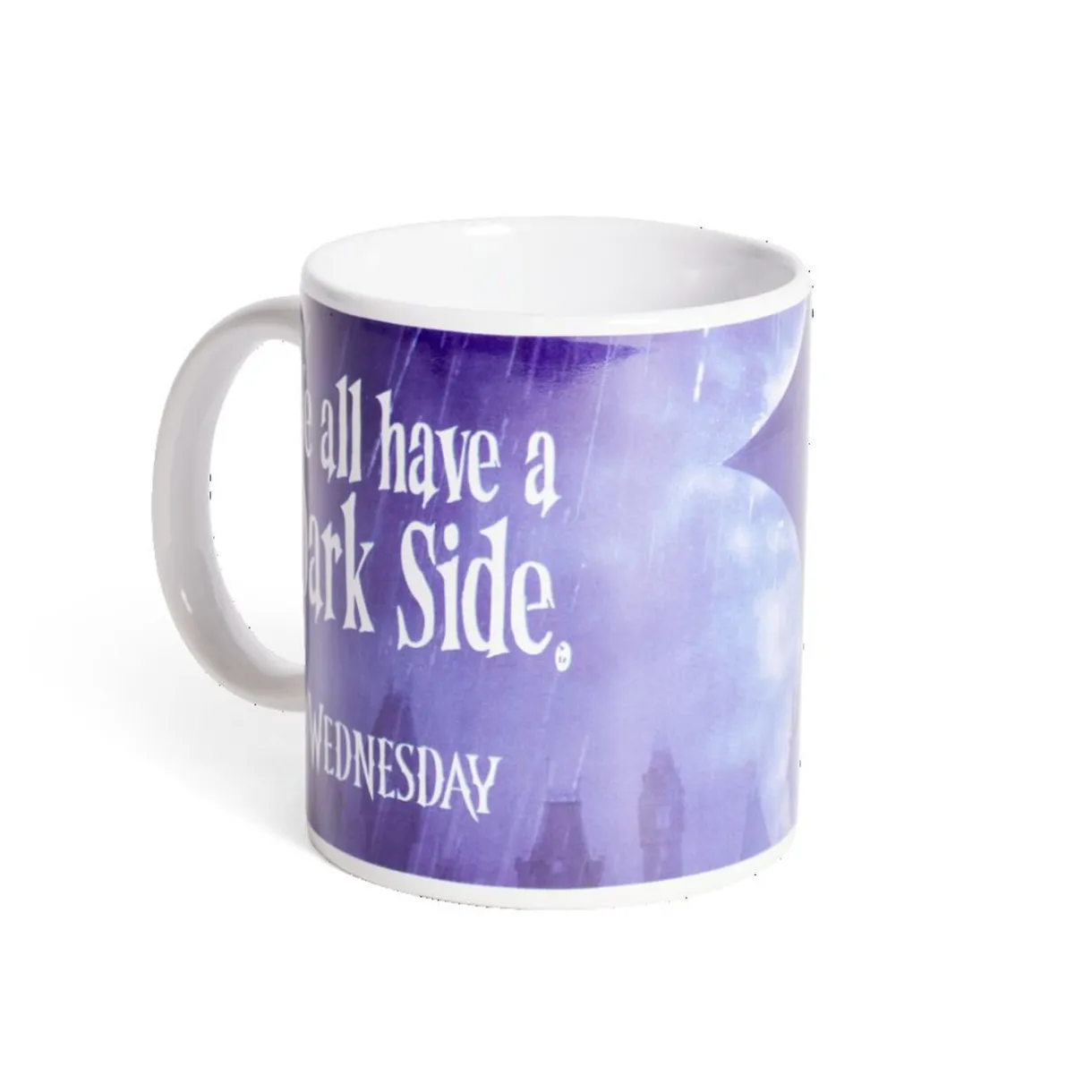 Plongez dans l’univers mystérieux de la Famille Addams avec ce mug représentant Mercredi avec l’inscription « We all have a dark side » (Nous avons tous un côté sombre).