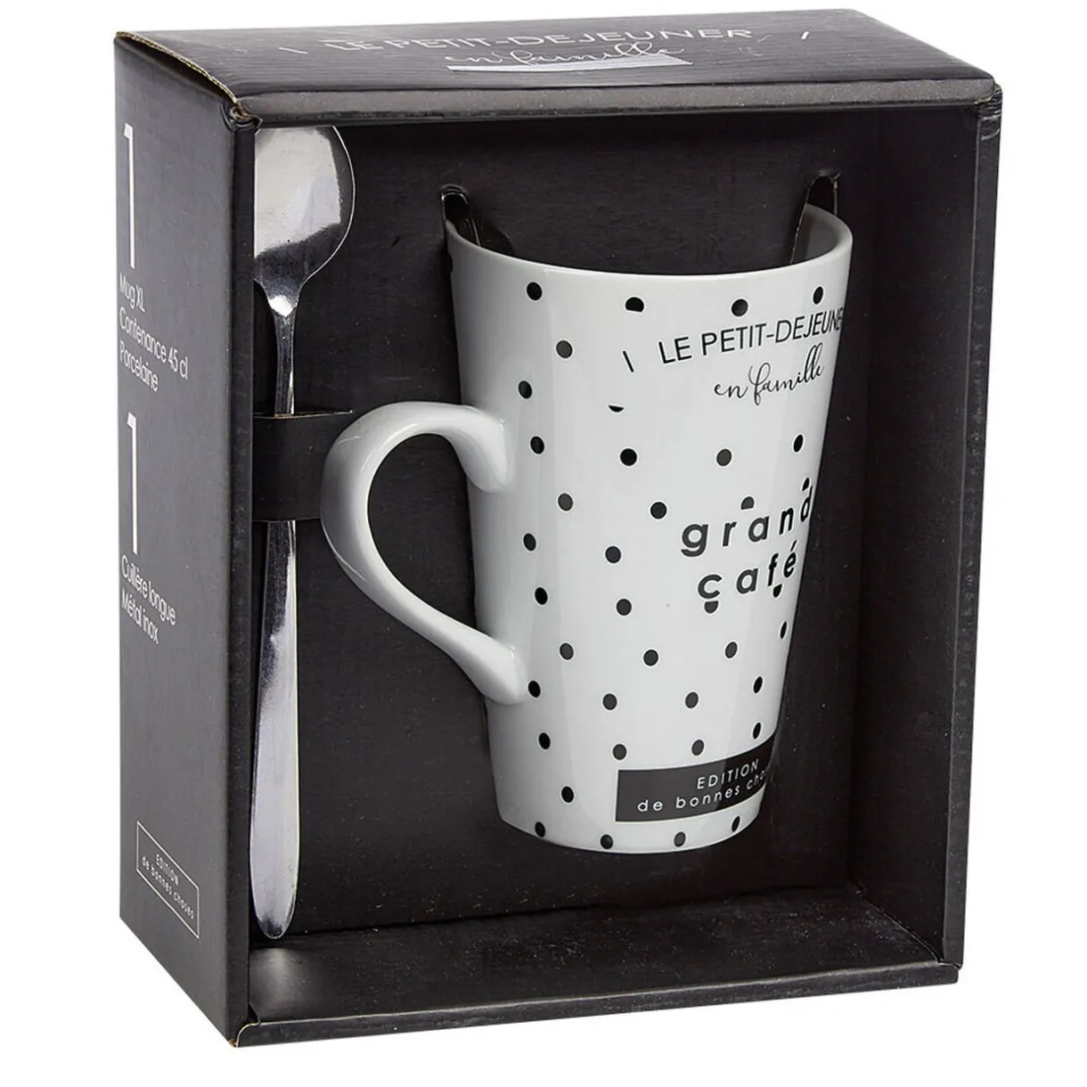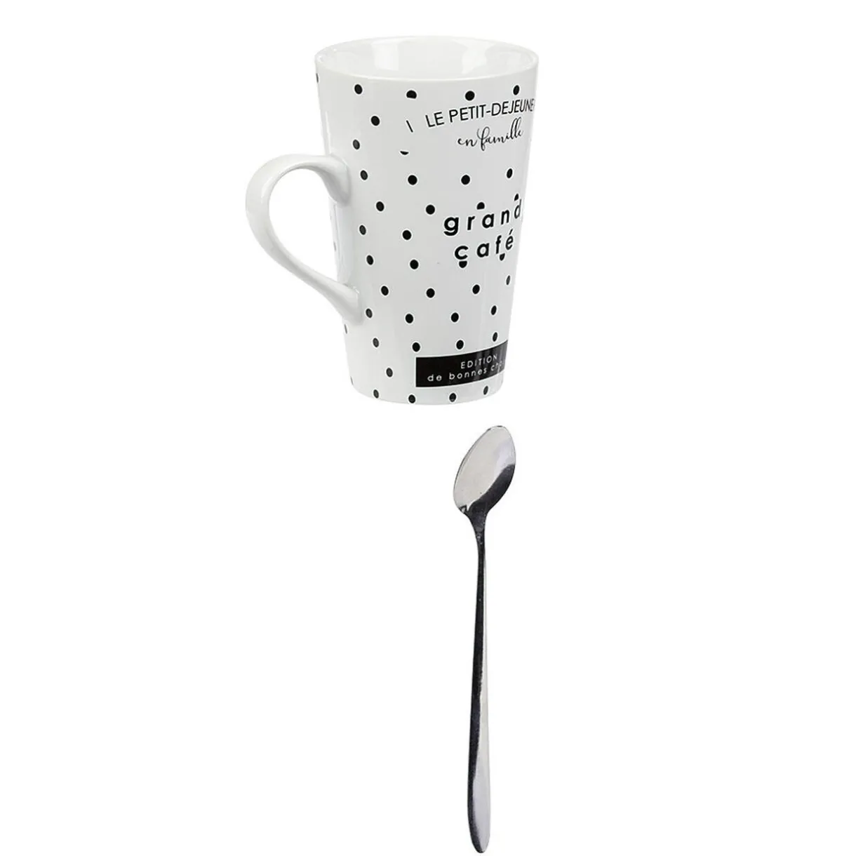 Mug design Grand café en porcelaine blanche et motif pois noirs. Une tasse toute mignonne livrée dans un coffret avec sa cuillère adaptée pour touiller et boire sa boisson chaude préférée avec style!