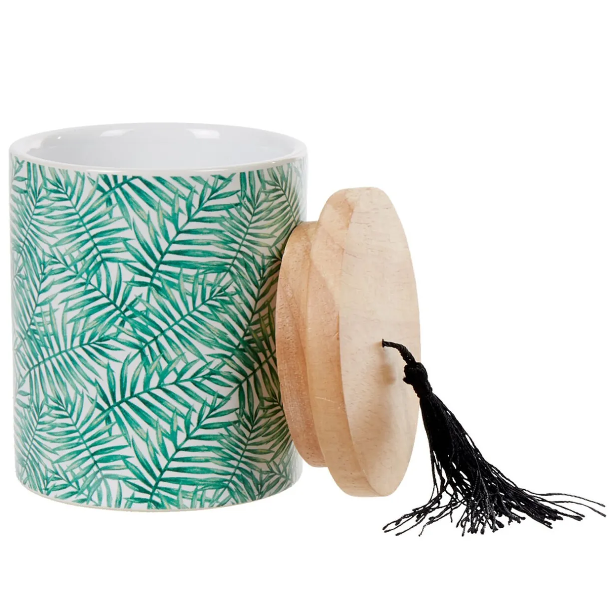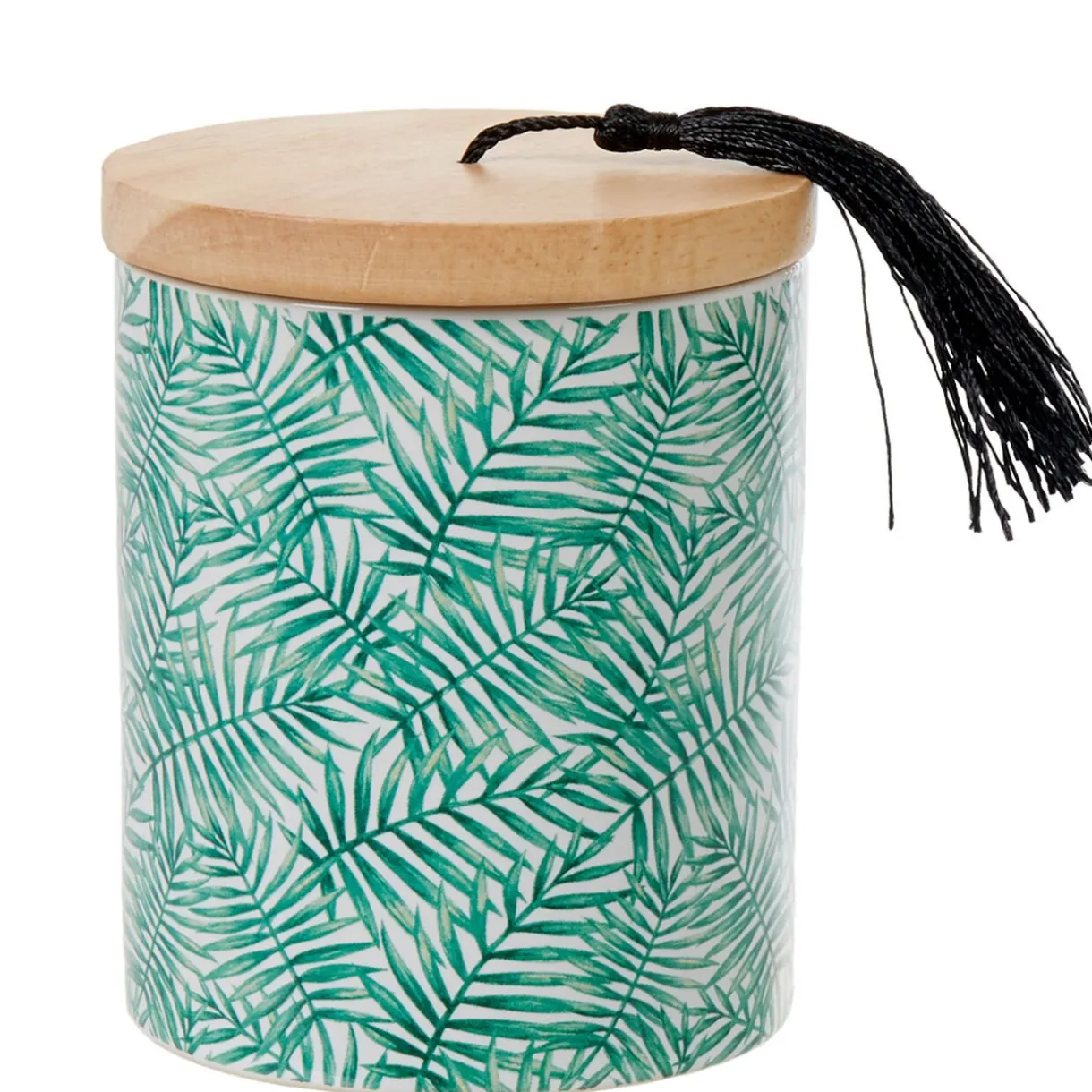 Ultra tendance, cette jolie boîte Jungle avec imprimé feuilles vertes et couvercle effet bois naturel et déco pompon noir. Idéal pour garder vos cotons ou coton-tiges à l’abri de l’humiditétout en ajoutant une notetropicale dans votre salle de bain.