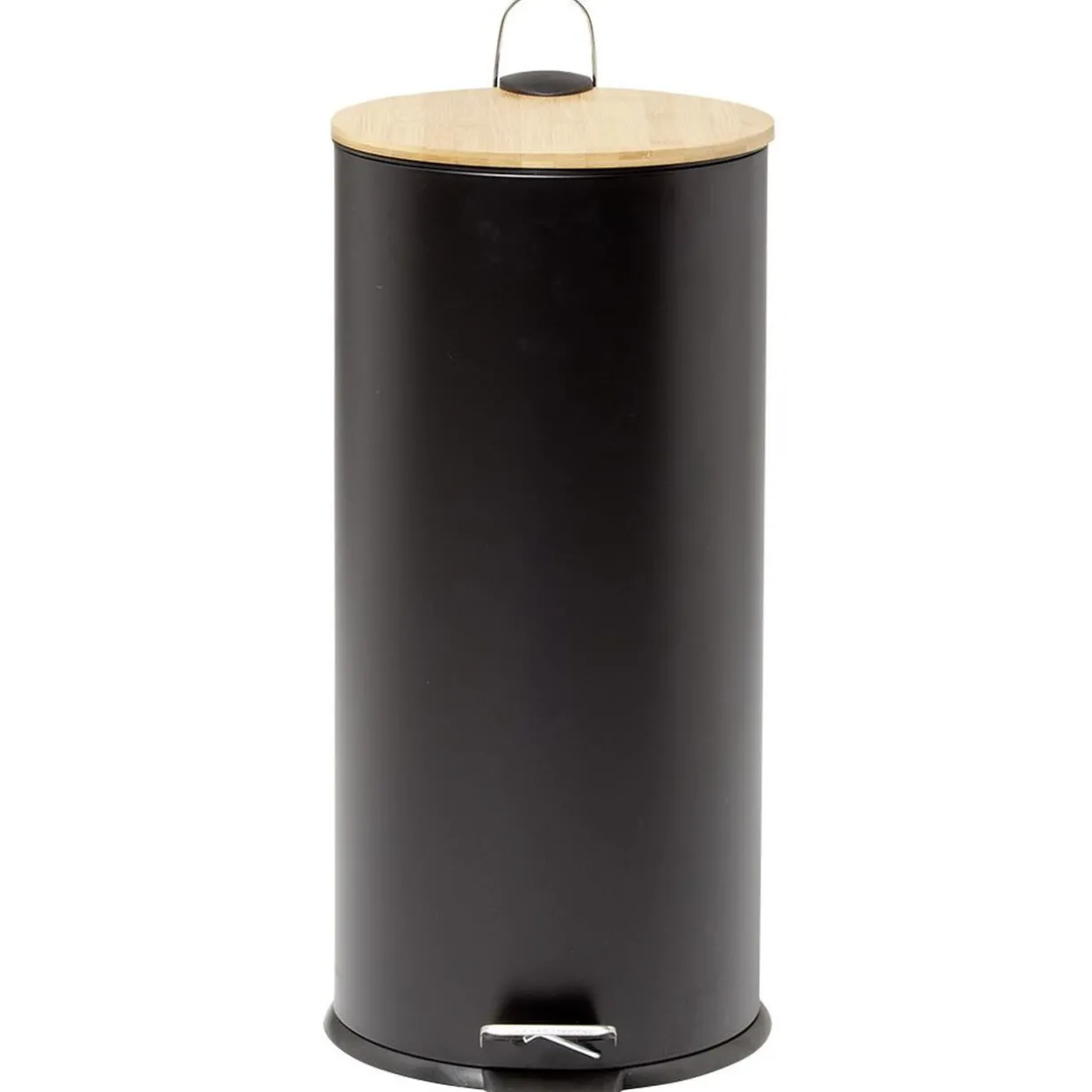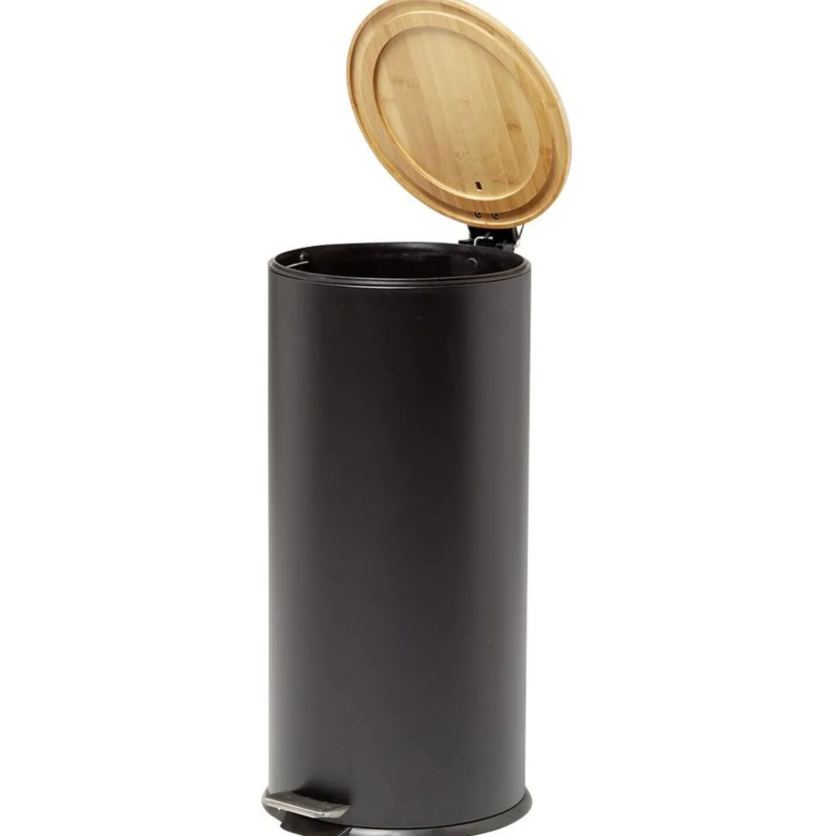 Cette poubelle à pédale ronde en métal noir est dotée d’un seau intérieur et se ferme avec un joli couvercle en bambou naturel.